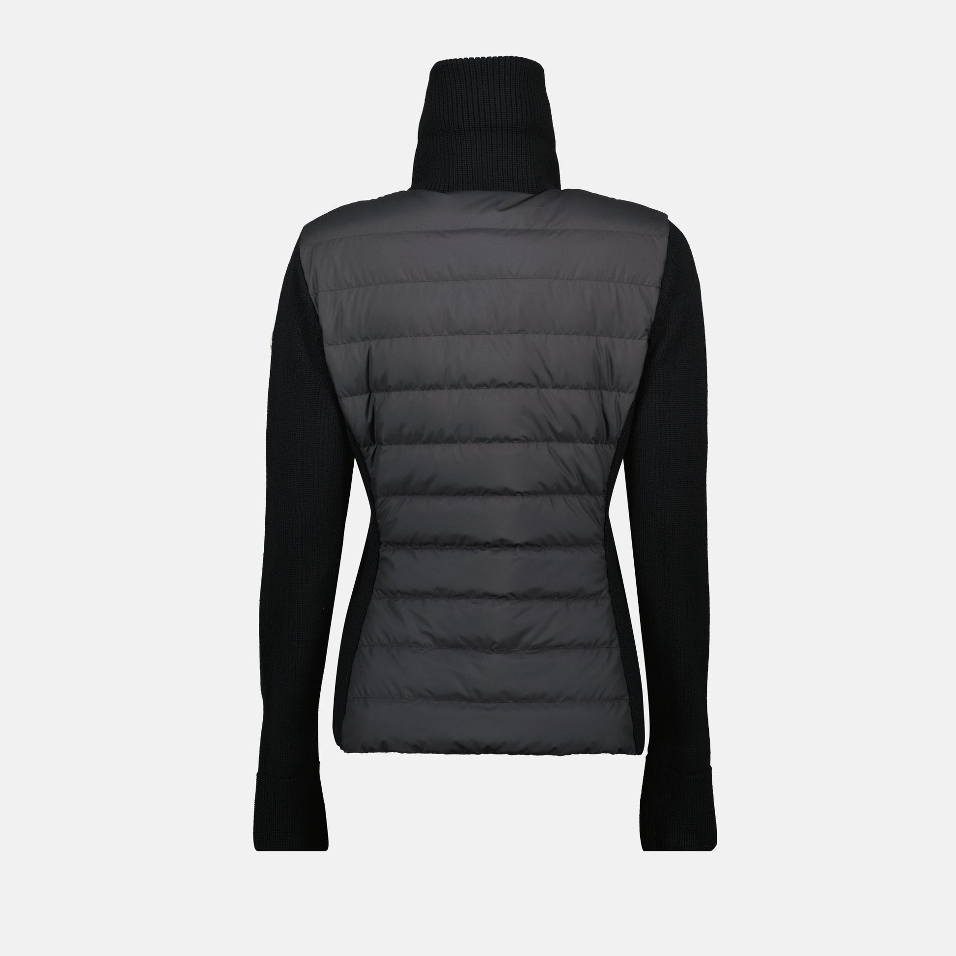 The black two-tone cardigan from Moncler is designed for women, combining wool and polyester for a modern style. It is part of the Autumn-Winter 2025 collection, offering comfort and elegance.