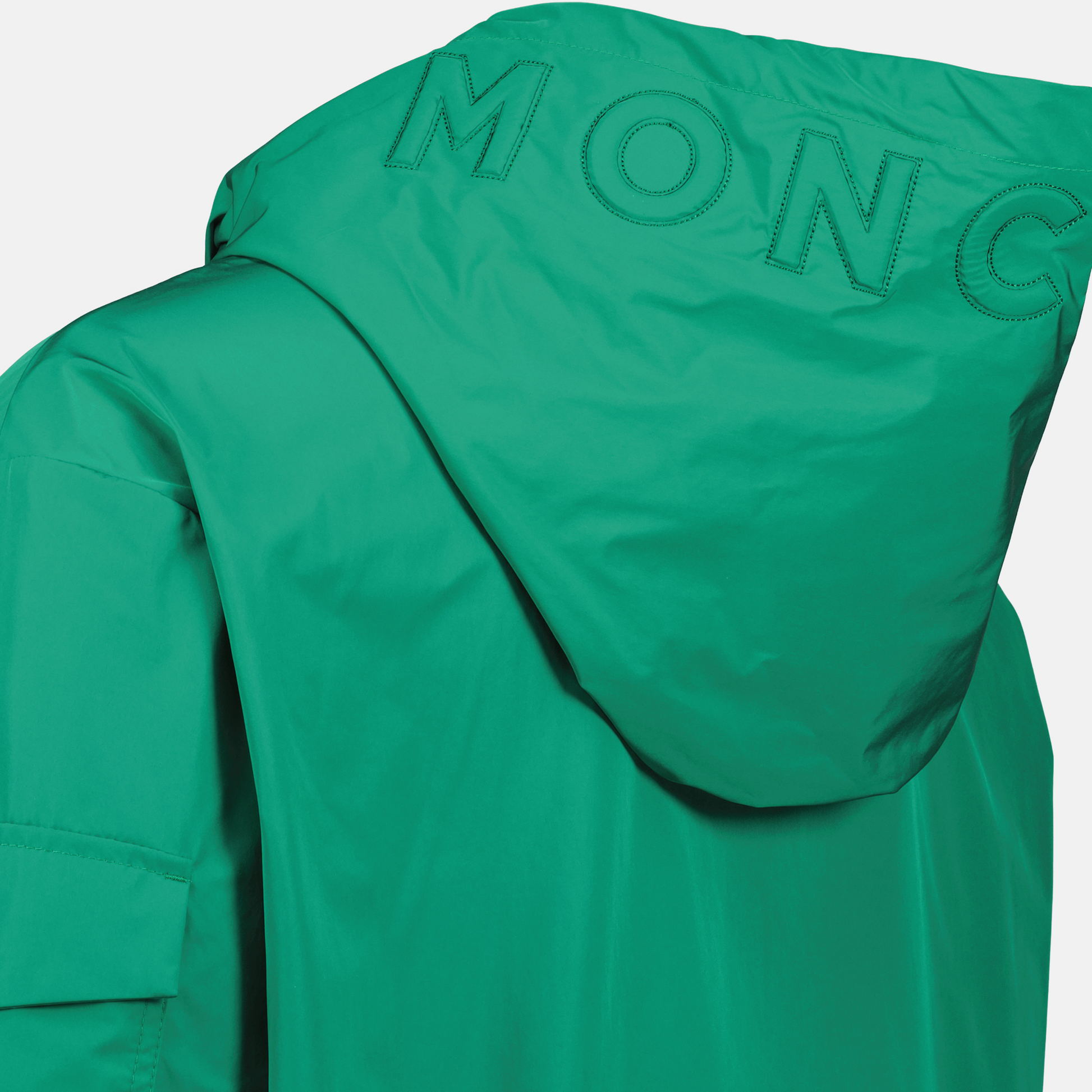 The green Sassière windbreaker from Moncler is a men's garment from the Spring-Summer 2025 collection. It is made of nylon with practical details such as an adjustable hood and side pockets.