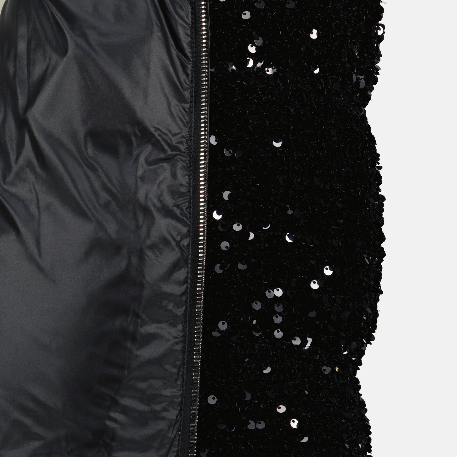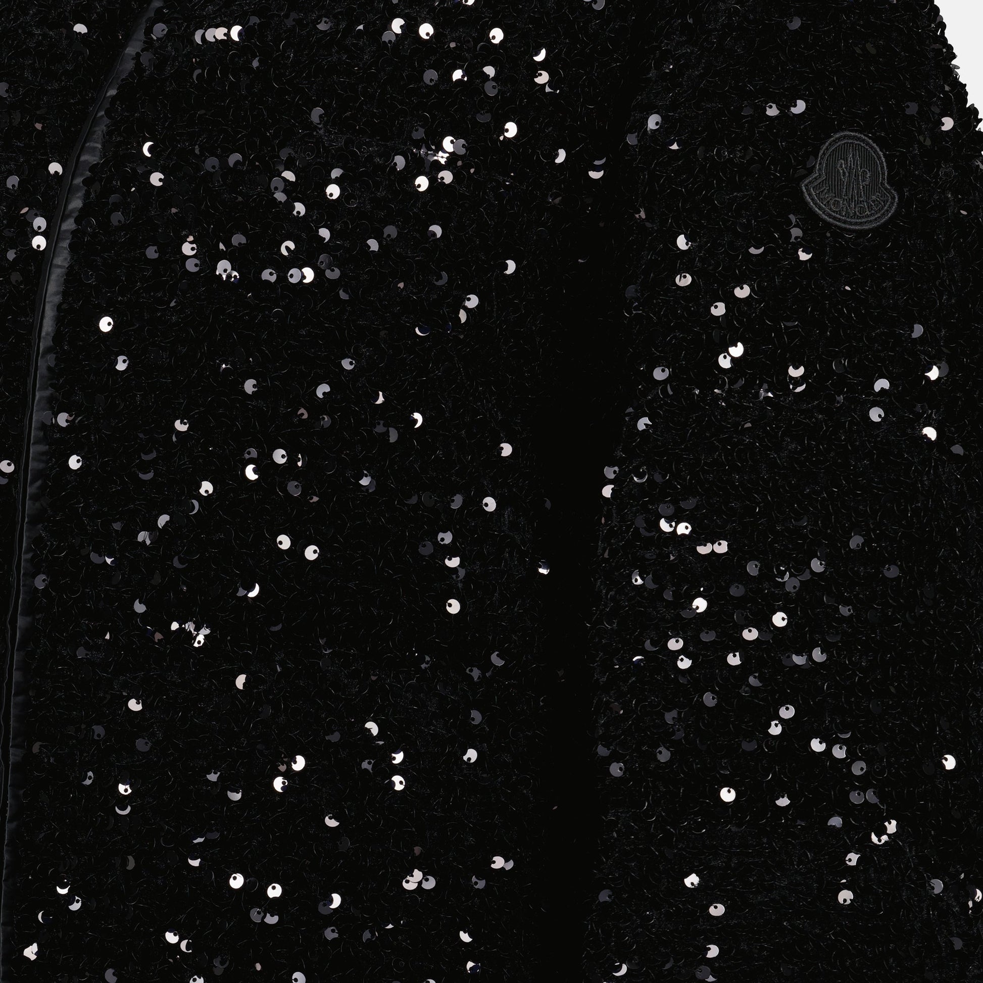 La doudoune Louvi de Moncler est une pièce féminine de la collection Automne-Hiver 2025. Elle se distingue par son revêtement en sequins noirs et son rembourrage en duvet.