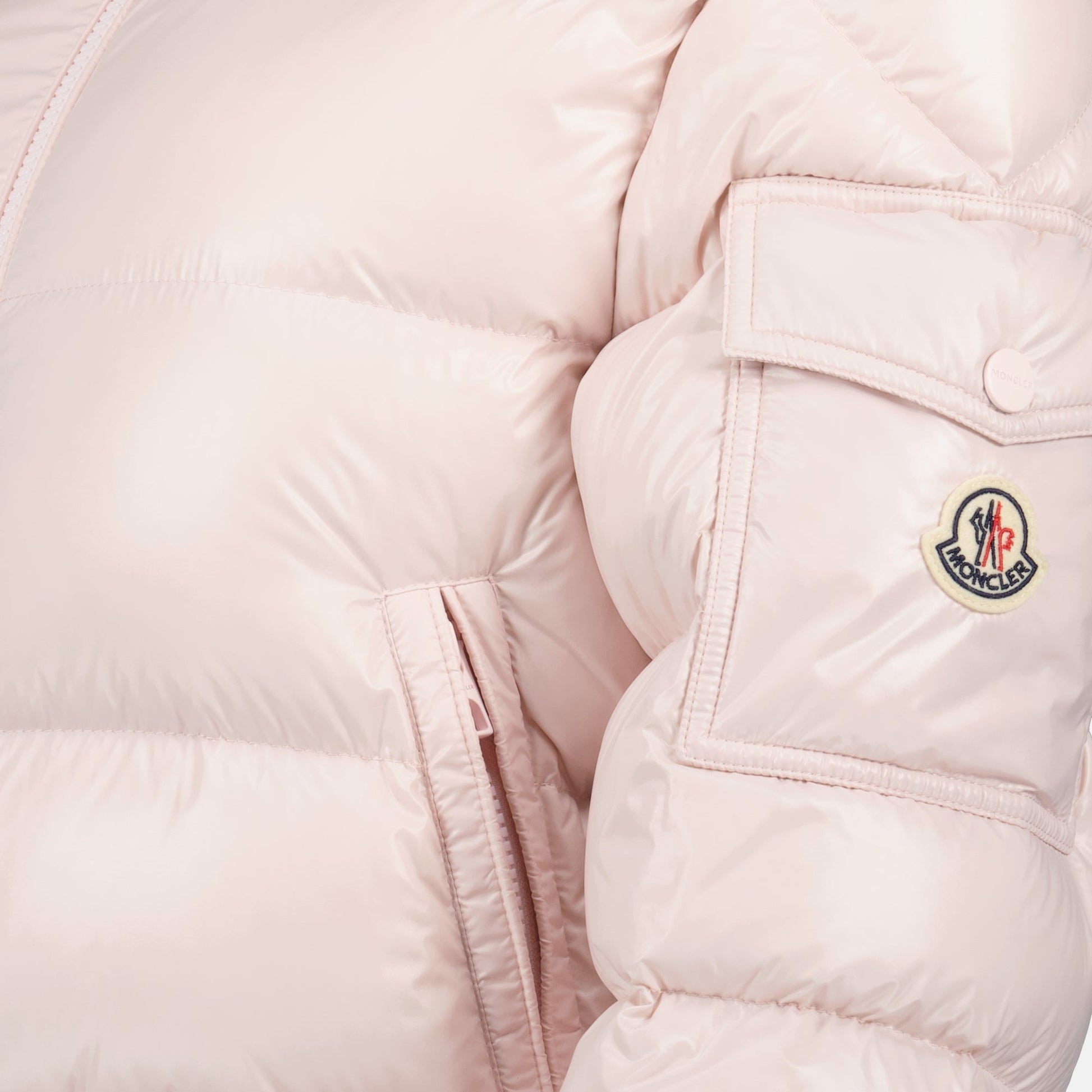 The pink Petra down jacket from Moncler is an elegant piece for women, designed for the Autumn-Winter 2025 collection. It stands out with its glossy nylon and practical details.