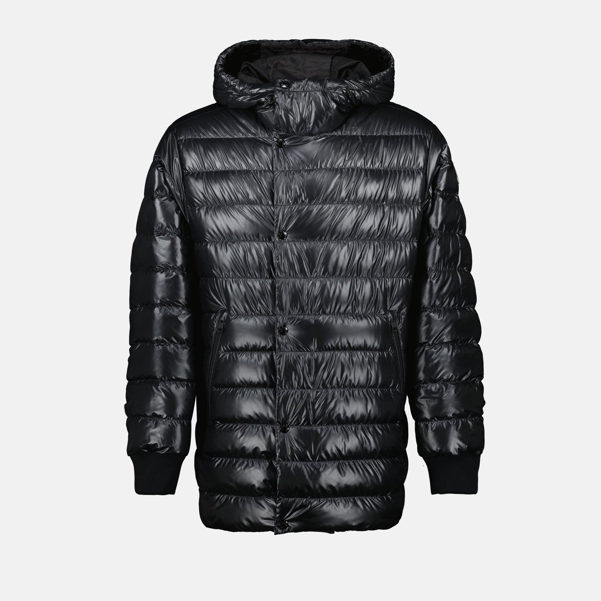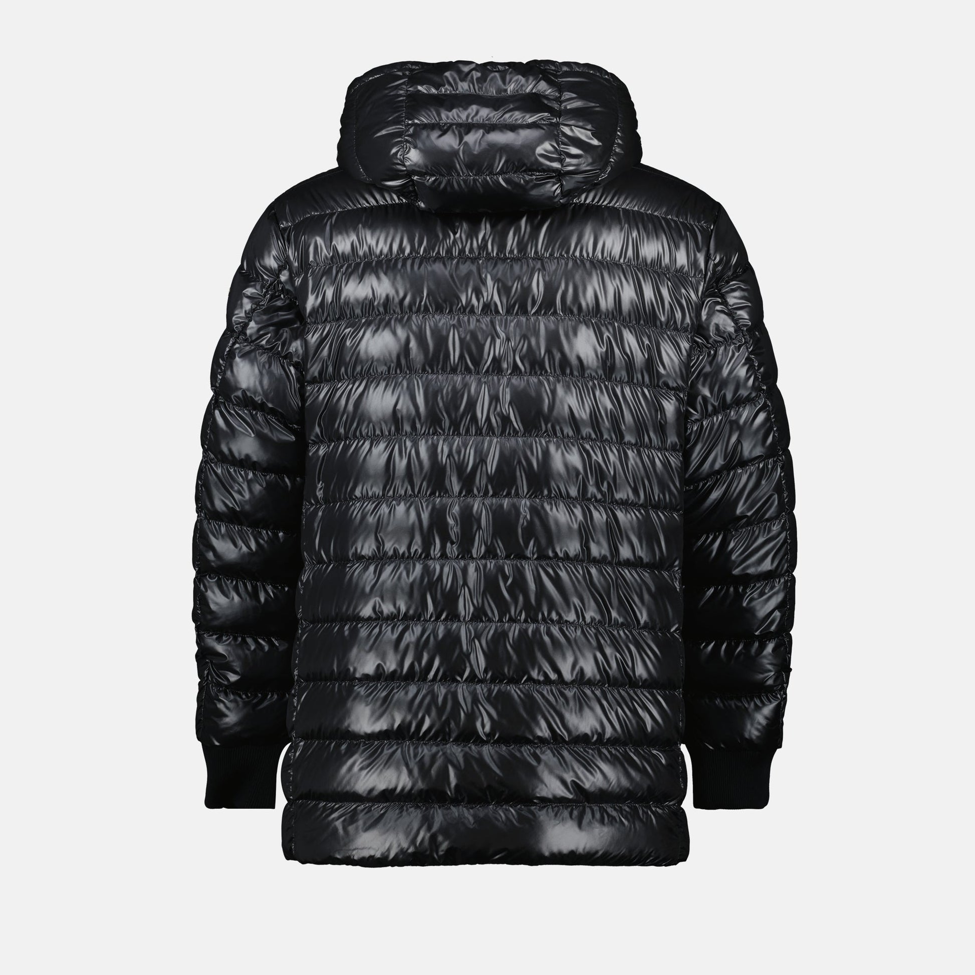 The black reversible Vernant down jacket from Moncler is a men's garment from the Spring-Summer 2025 collection. It features a smooth side and a side with quilted baffles.