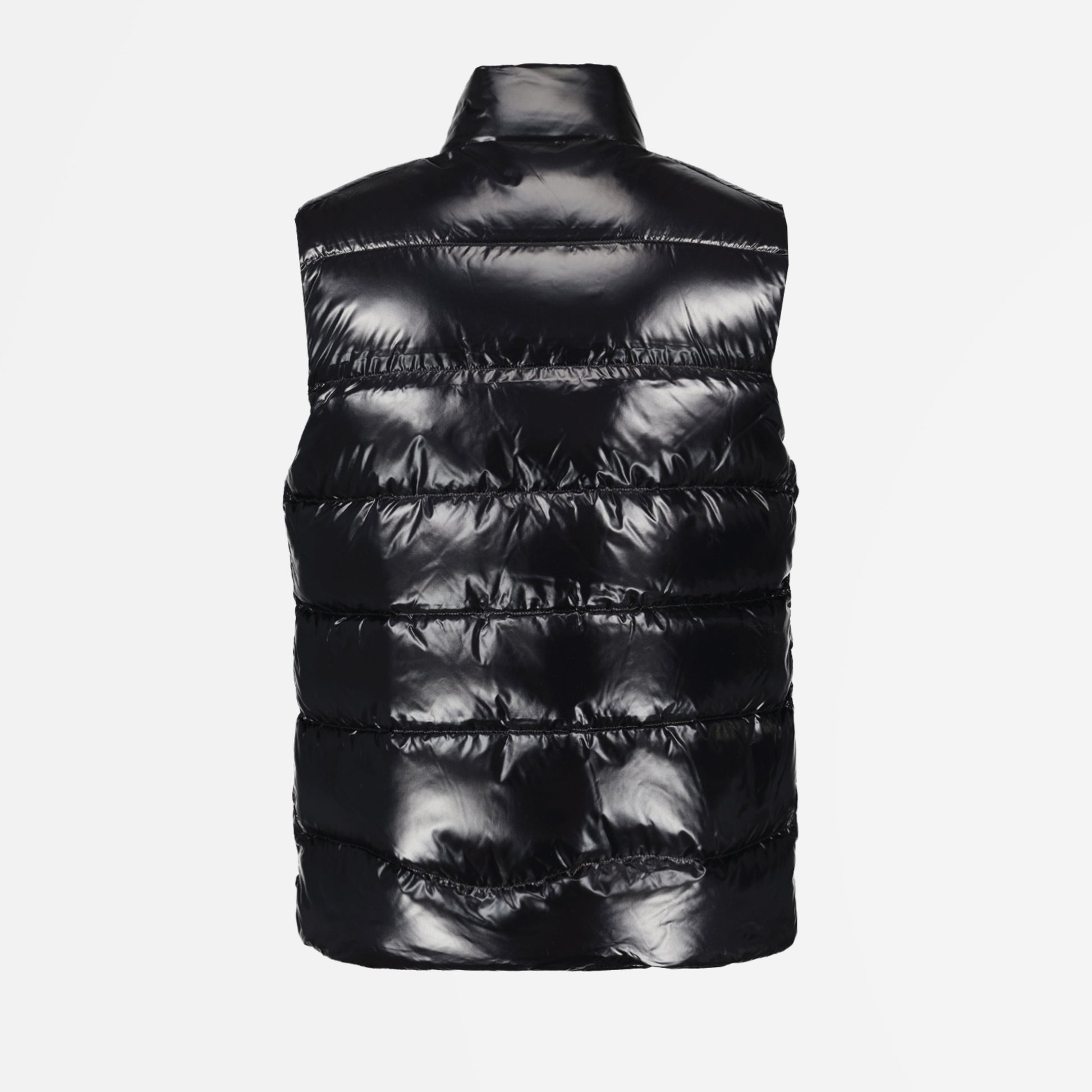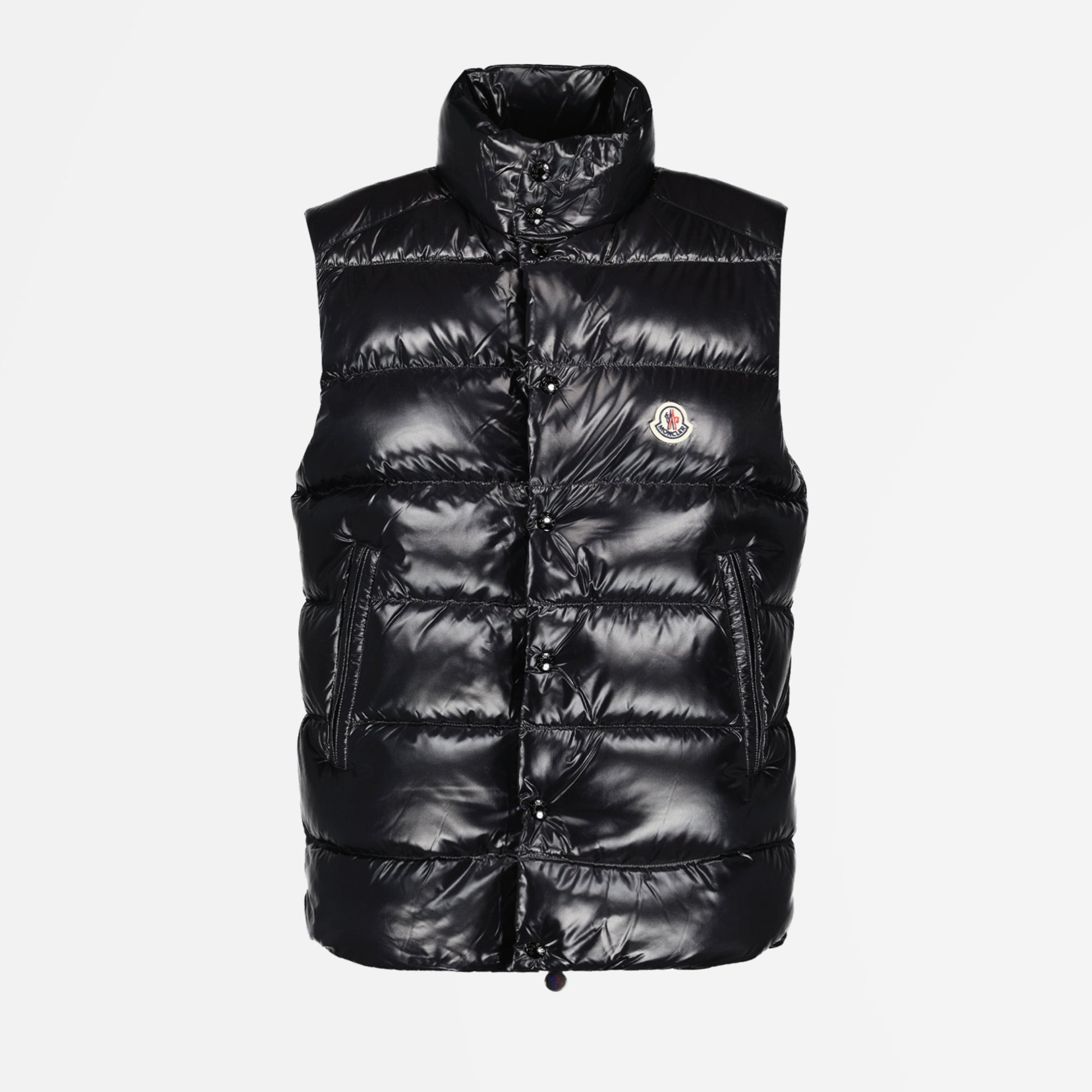 The black Tibb sleeveless down jacket from Moncler is a men's garment from the Autumn-Winter 2025 collection. It features an elegant design with a high collar and zipped side pockets.