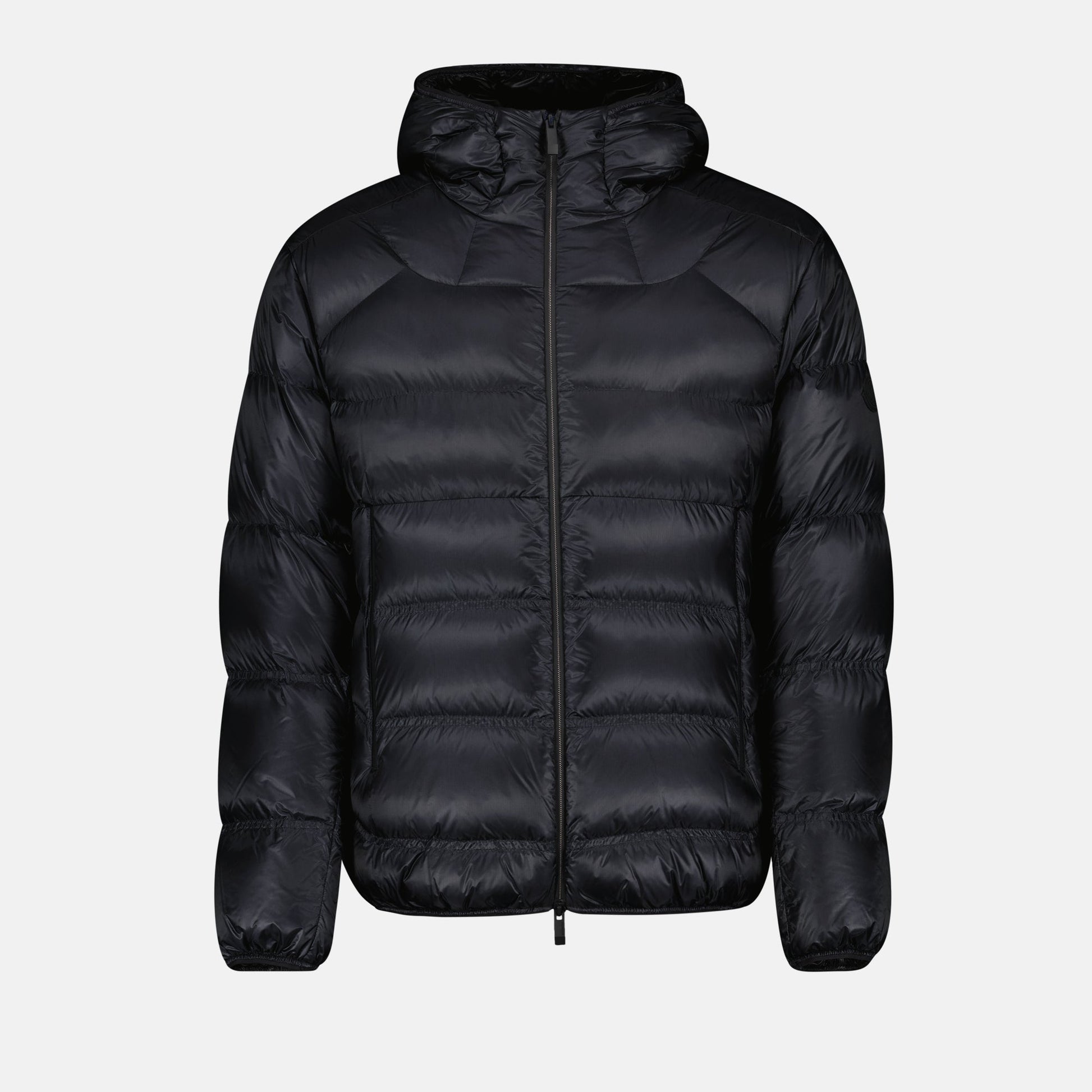 The navy blue Viani down jacket from Moncler is a men's garment from the Autumn-Winter 2024 collection. It features down filling, a removable hood, and side pockets.
