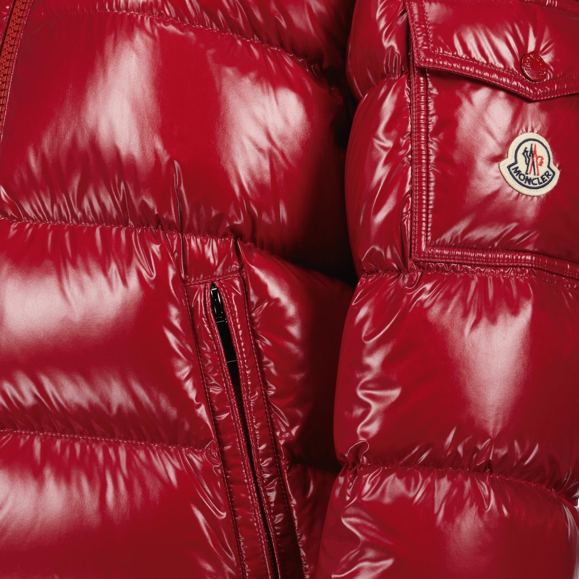 Red Maire down jacket from Moncler for women, combining style and comfort. This piece is part of the Autumn-Winter 2025 collection, made from lacquered nylon with down padding.