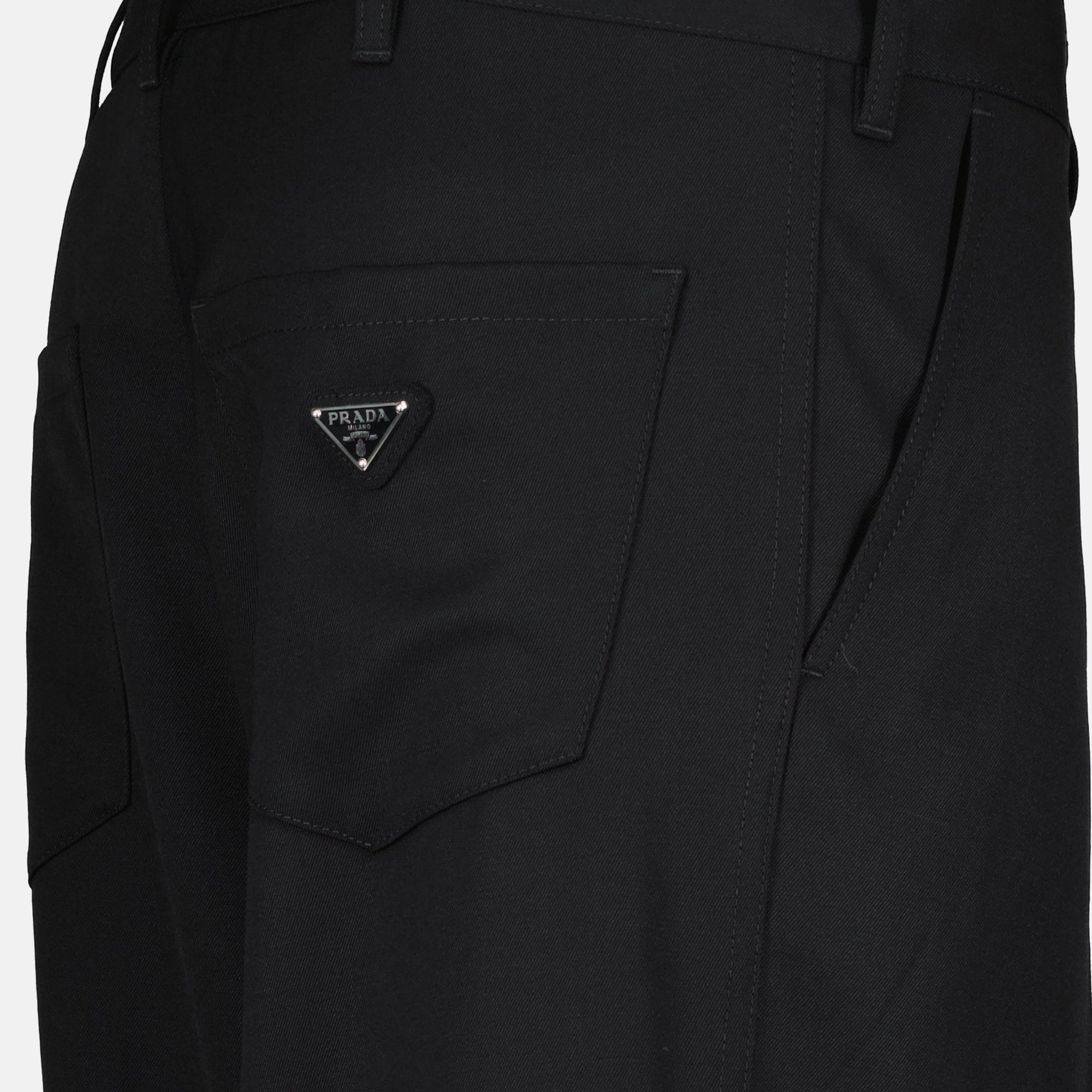 Black wool trousers from Prada for men, part of the Autumn-Winter 2025 collection. It features a straight cut with button and zip closure as well as side pockets.