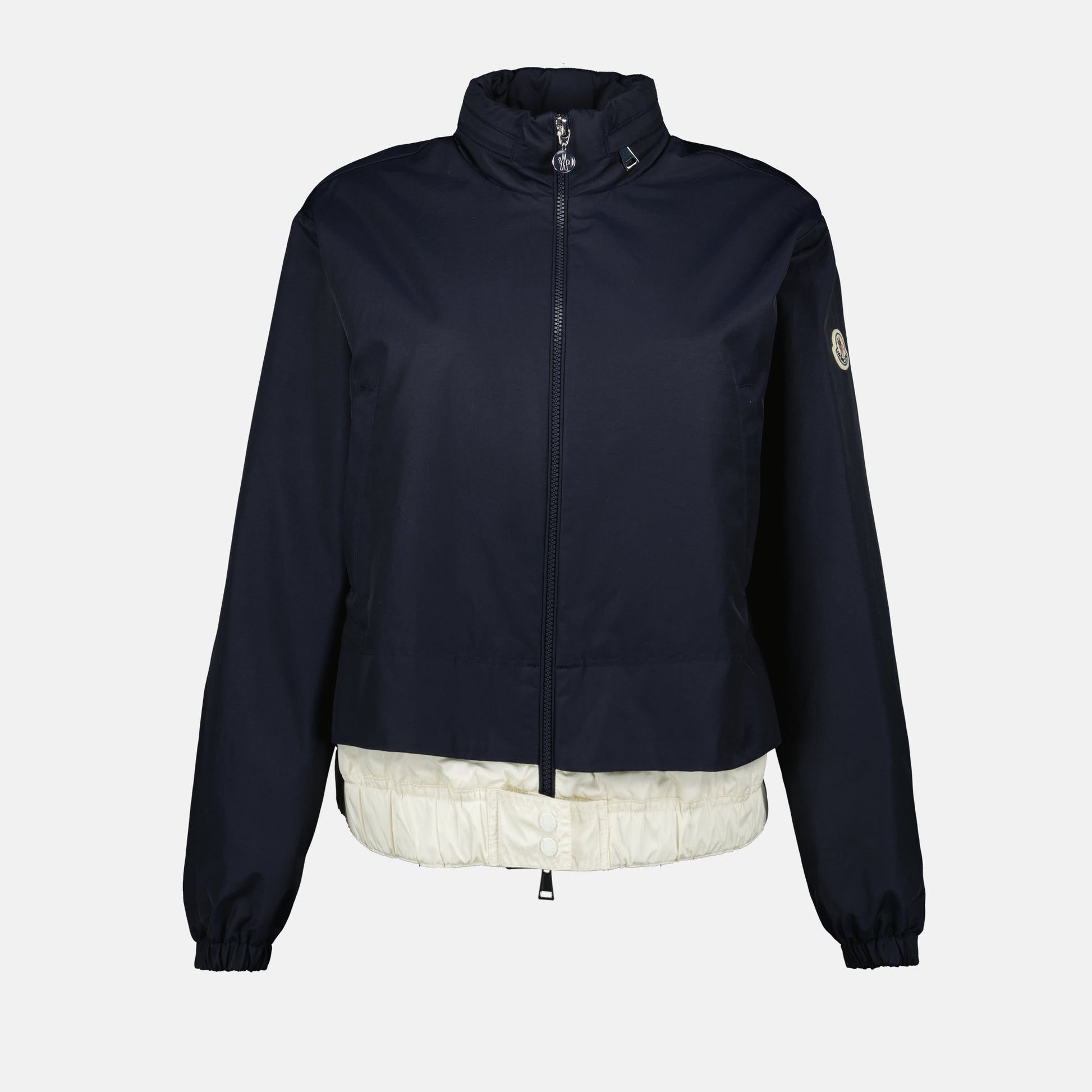 The blue and white Janze bicolor jacket from Moncler is designed for women. It is part of the Spring-Summer 2025 collection and is made of technical twill.