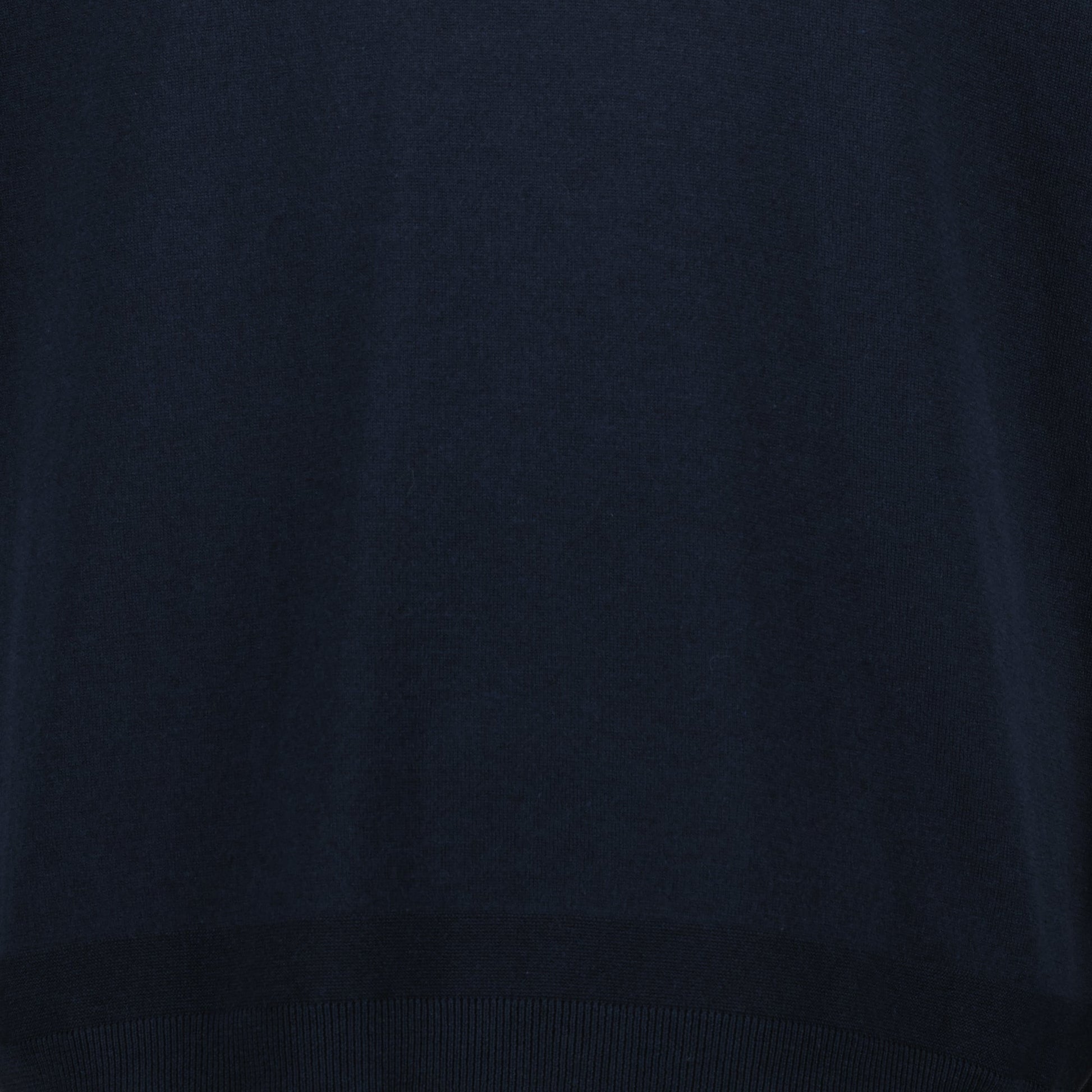 Navy blue short-sleeve sweater from the brand Moncler for men. It is part of the Spring-Summer 2025 collection and is made of cotton and silk with meticulous details.