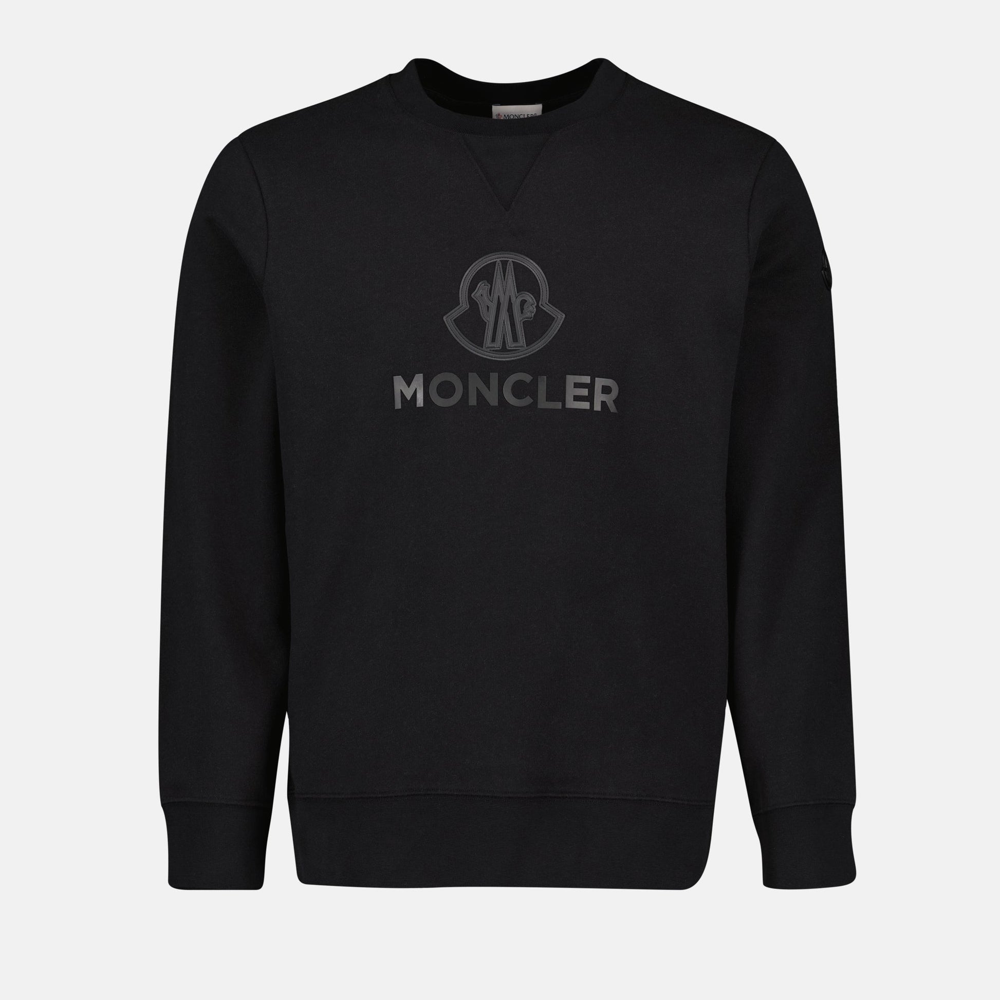 Black logo sweatshirt by Moncler for men. This piece is part of the Autumn-Winter 2024 collection and is made of cotton and cashmere with a leather logo.