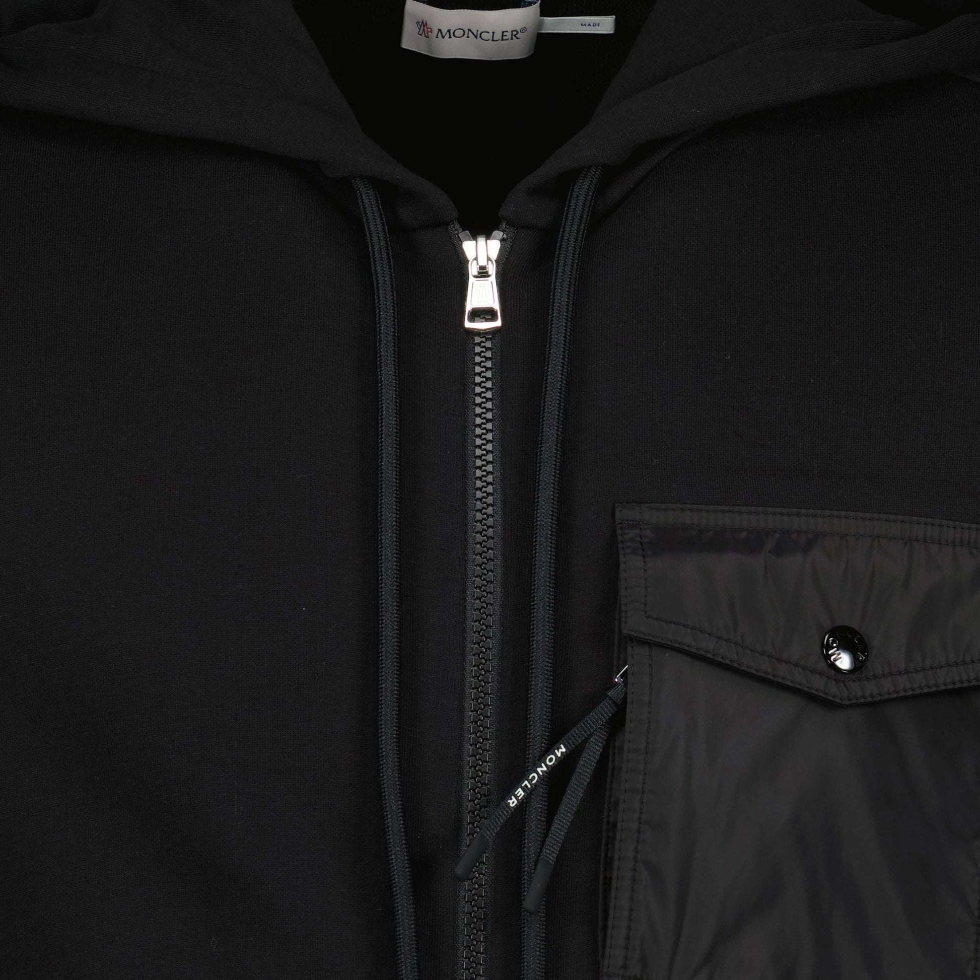 Le sweatshirt zippé noir de Moncler, conçu pour homme, présente une coupe droite avec des détails en coton et nylon. Il fait partie de la collection Automne-Hiver 2025.