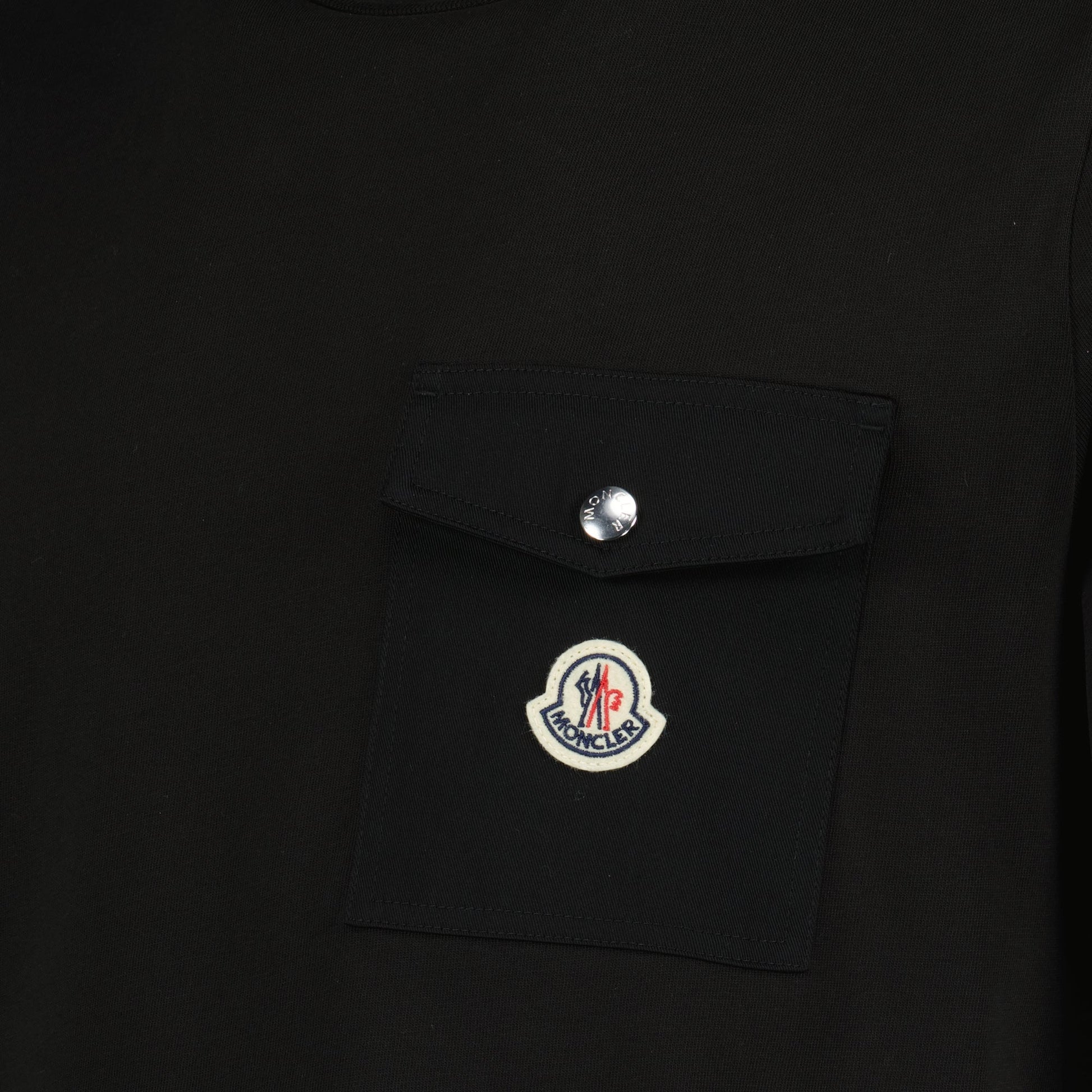 Black logo pocket T-shirt from the brand Moncler for men. This piece is part of the Spring-Summer 2025 collection and is made from cotton with a felt logo.