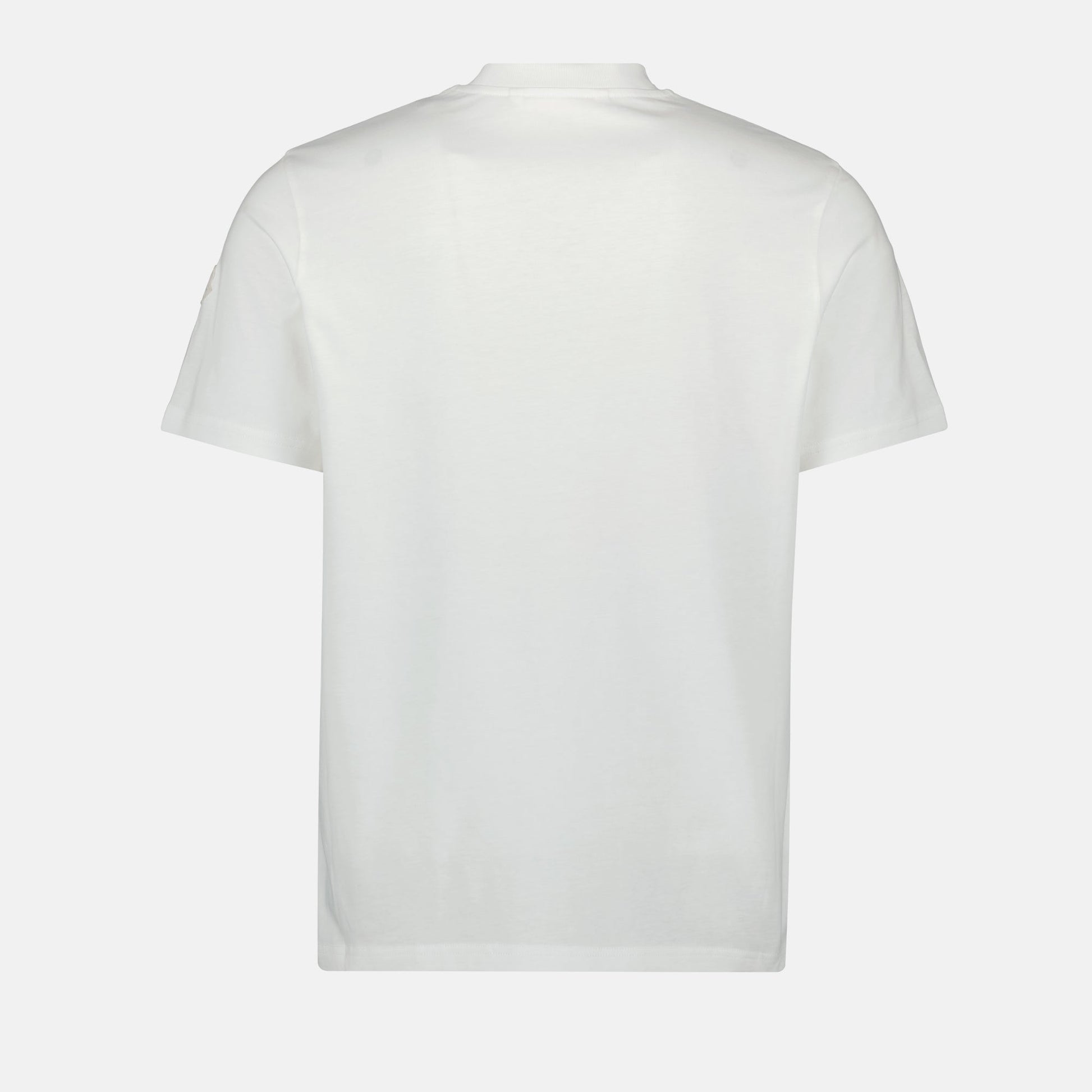 White Mascotte logo T-shirt by Moncler, designed for men, features a round neck and short sleeves. From the Autumn-Winter 2025 collection, it showcases a distinctive printed pattern.