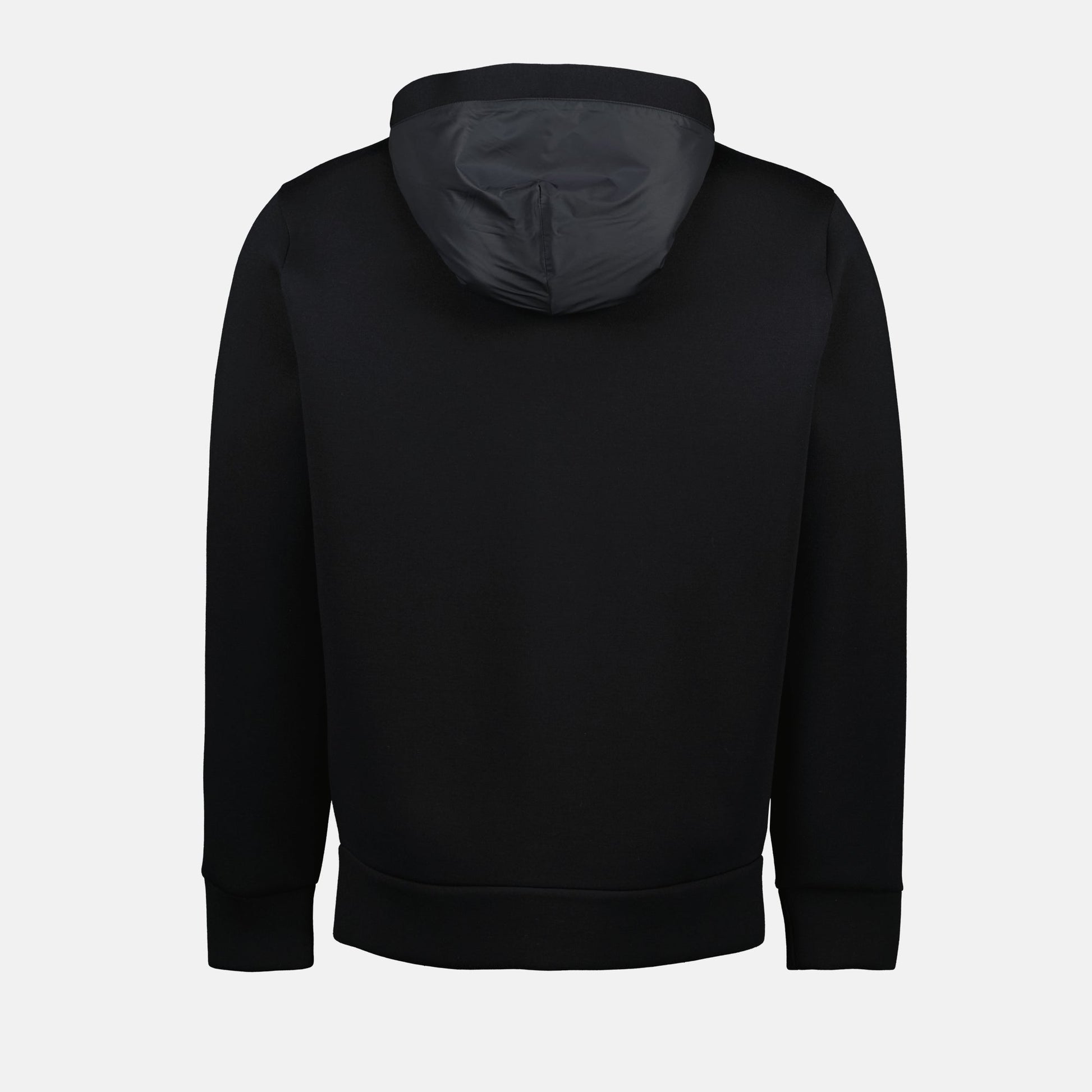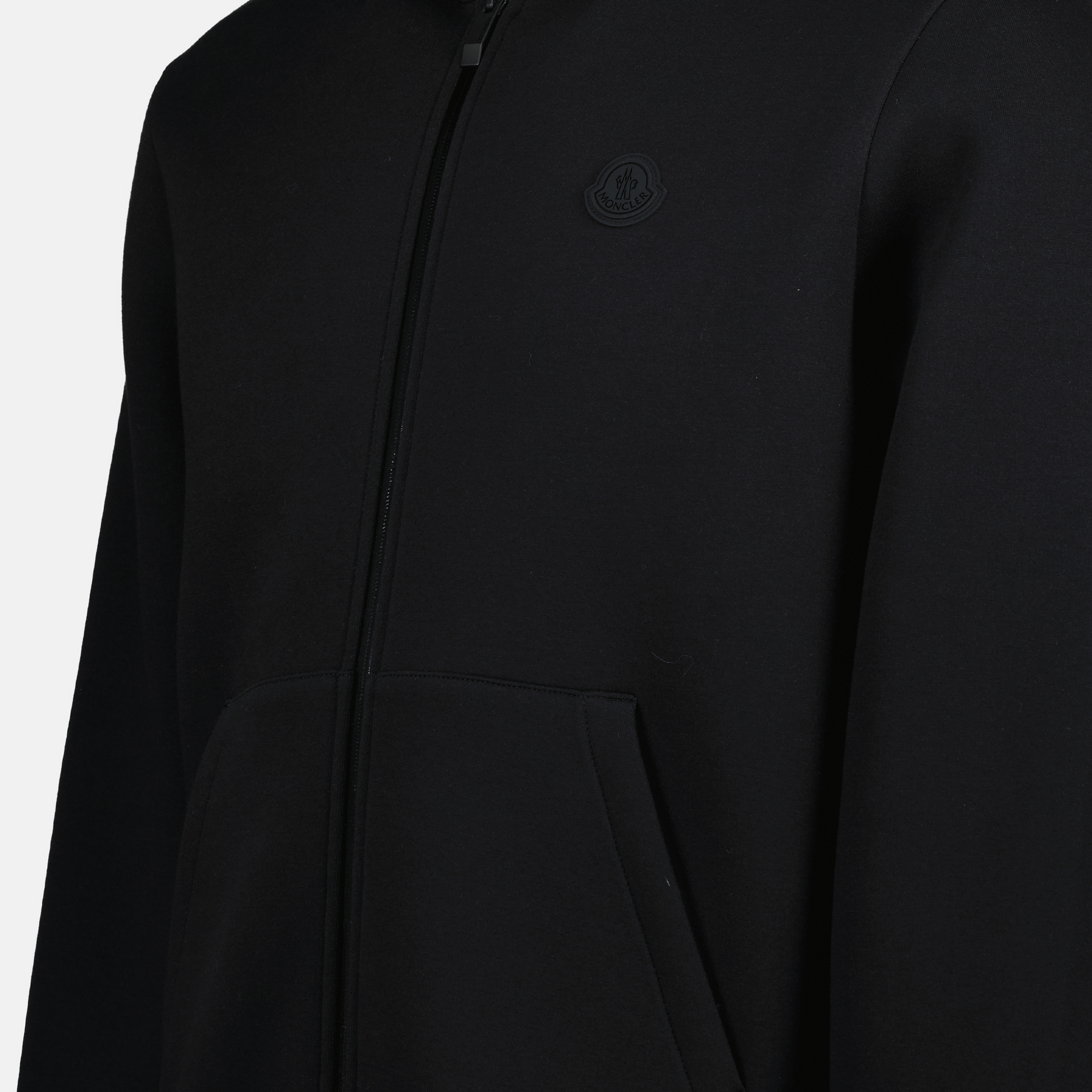 Black zip-up neoprene sweatshirt by Moncler for men, Spring-Summer 2025 collection. It features a high collar, a recycled nylon hood, and a leather patch logo.