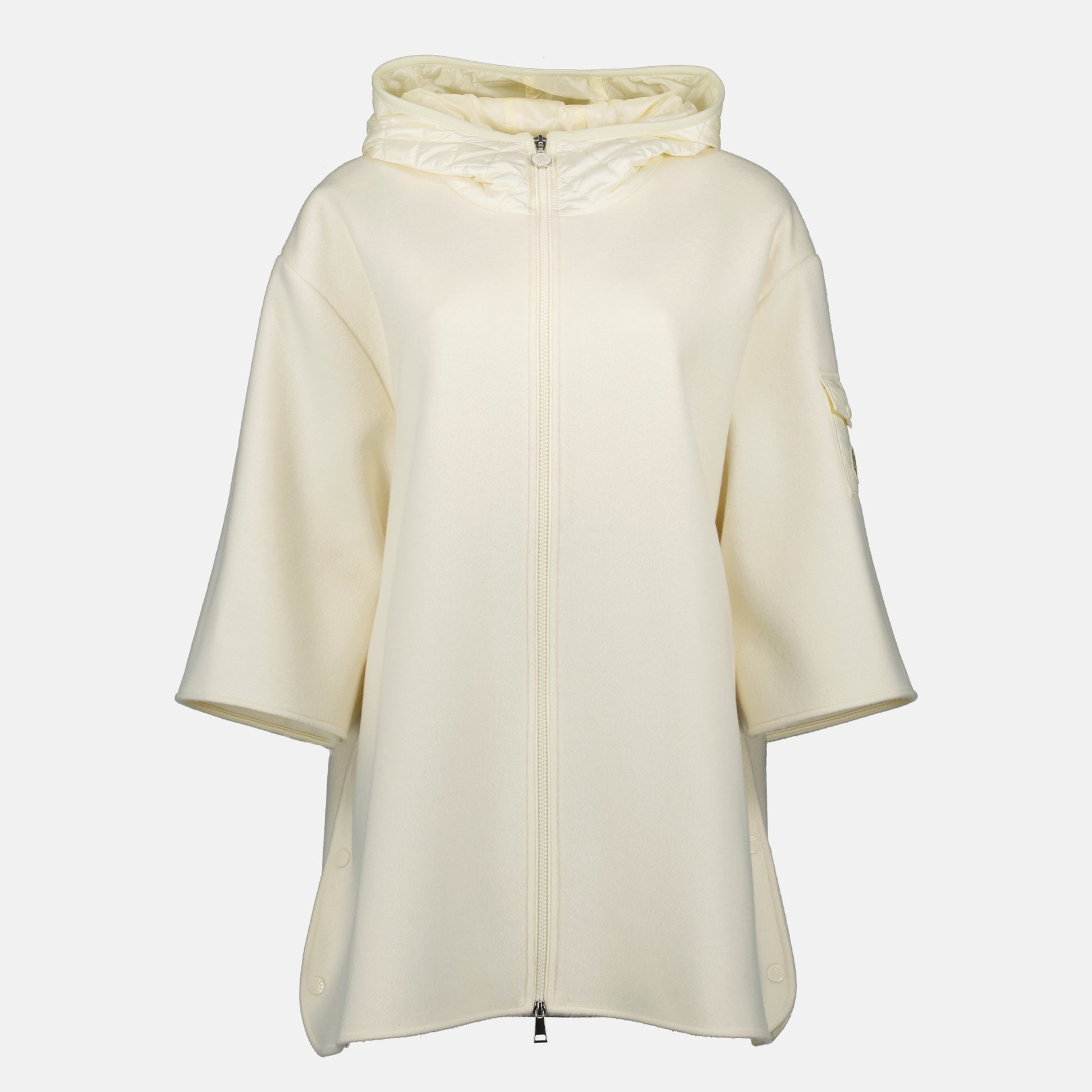 Zipped white wool cape from the brand Moncler for women, Autumn-Winter 2025 collection. It features a high collar, three-quarter sleeves, and a padded hood.