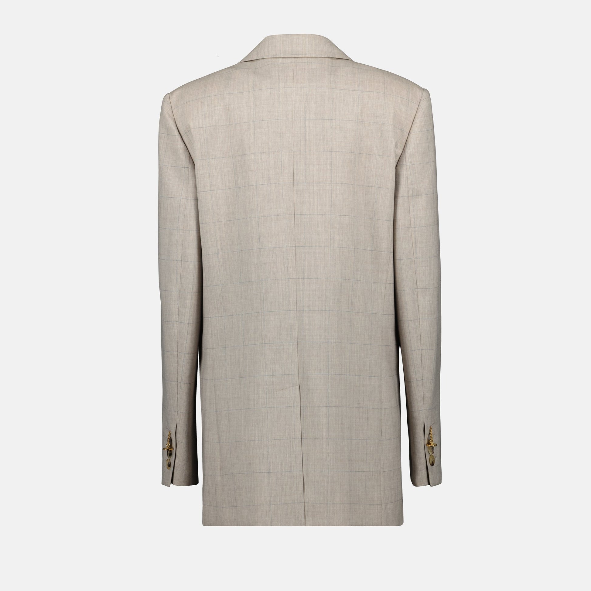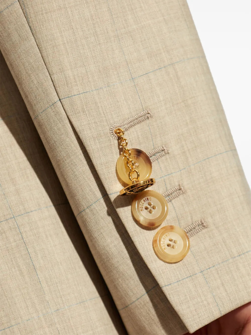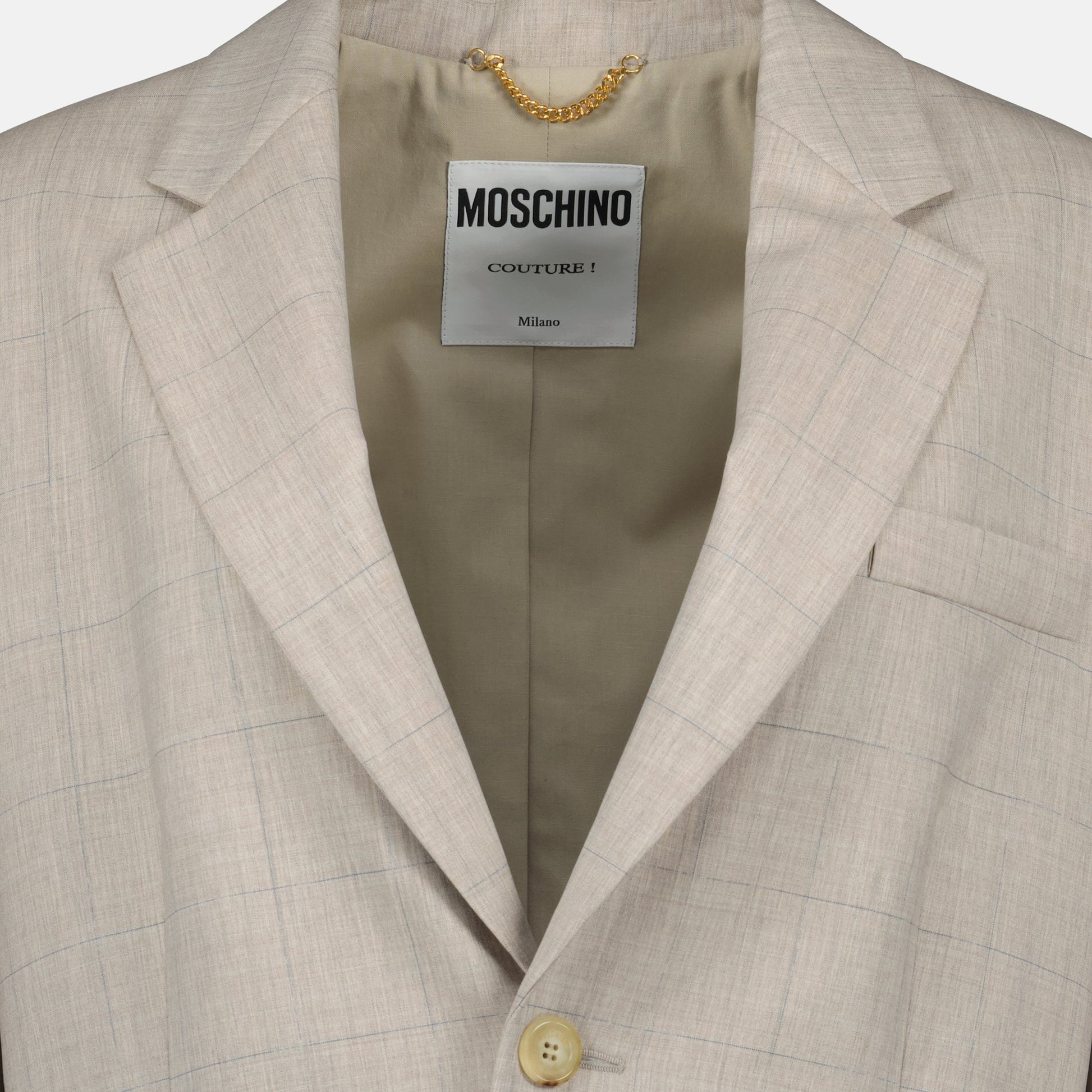 Beige checkered blazer from the brand Moschino for women. This piece is part of the Spring-Summer 2025 collection and is made of wool with a fitted cut and elegant details.