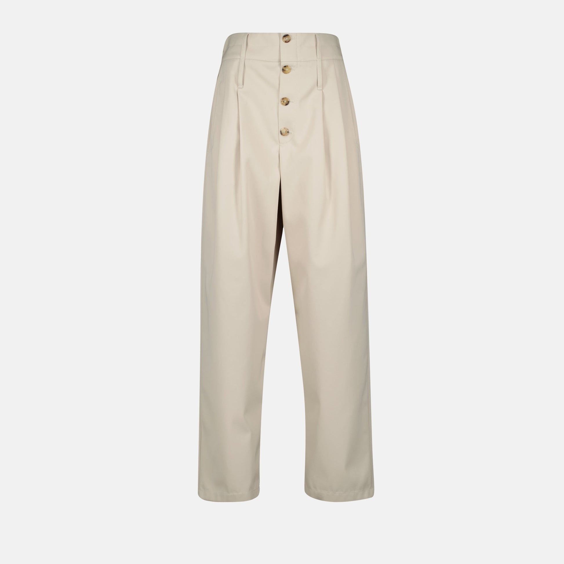 Buttoned pleated trousers from Moschino for women, made of polyester and cotton. This model from the Spring-Summer 2025 collection features a cigarette cut and a high waist with double belt loops.