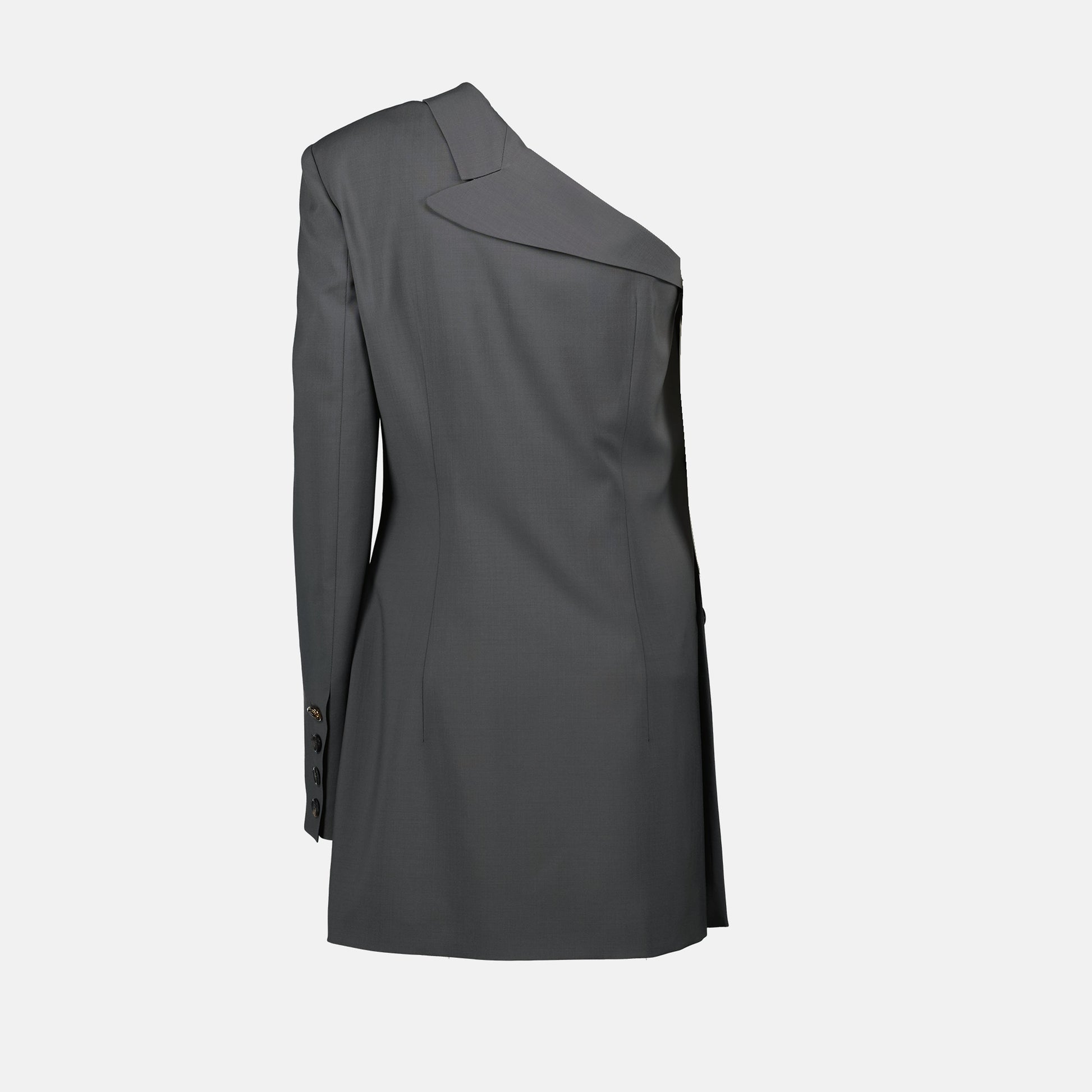Gray asymmetrical blazer dress by Moschino for women, made from wool. This piece is part of the Spring-Summer 2025 collection and features an asymmetrical design with one sleeve and an original neckline.