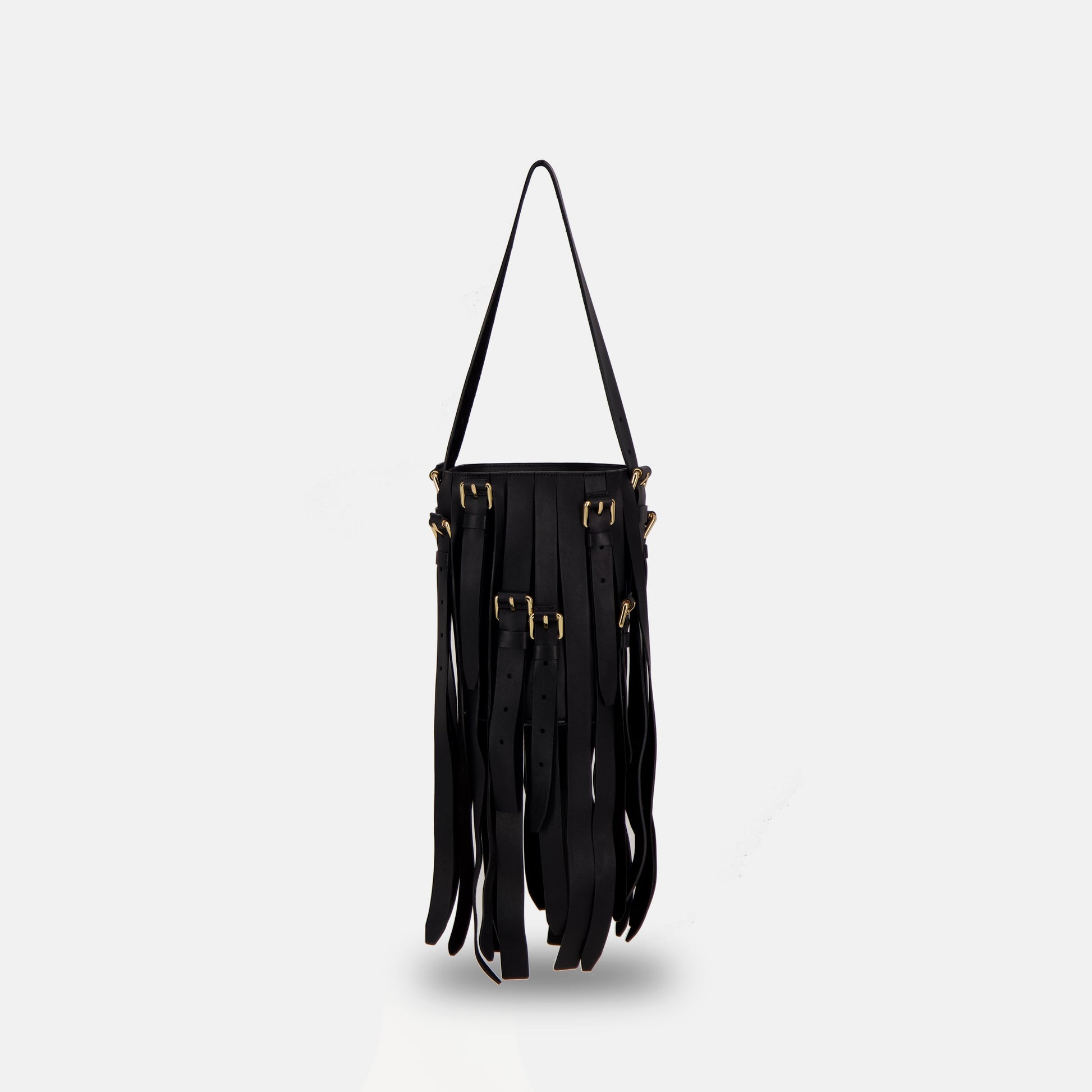 The Multibets bucket bag from Moschino is a black nappa leather accessory for women. It is part of the Spring-Summer 2025 collection, combining style and functionality.