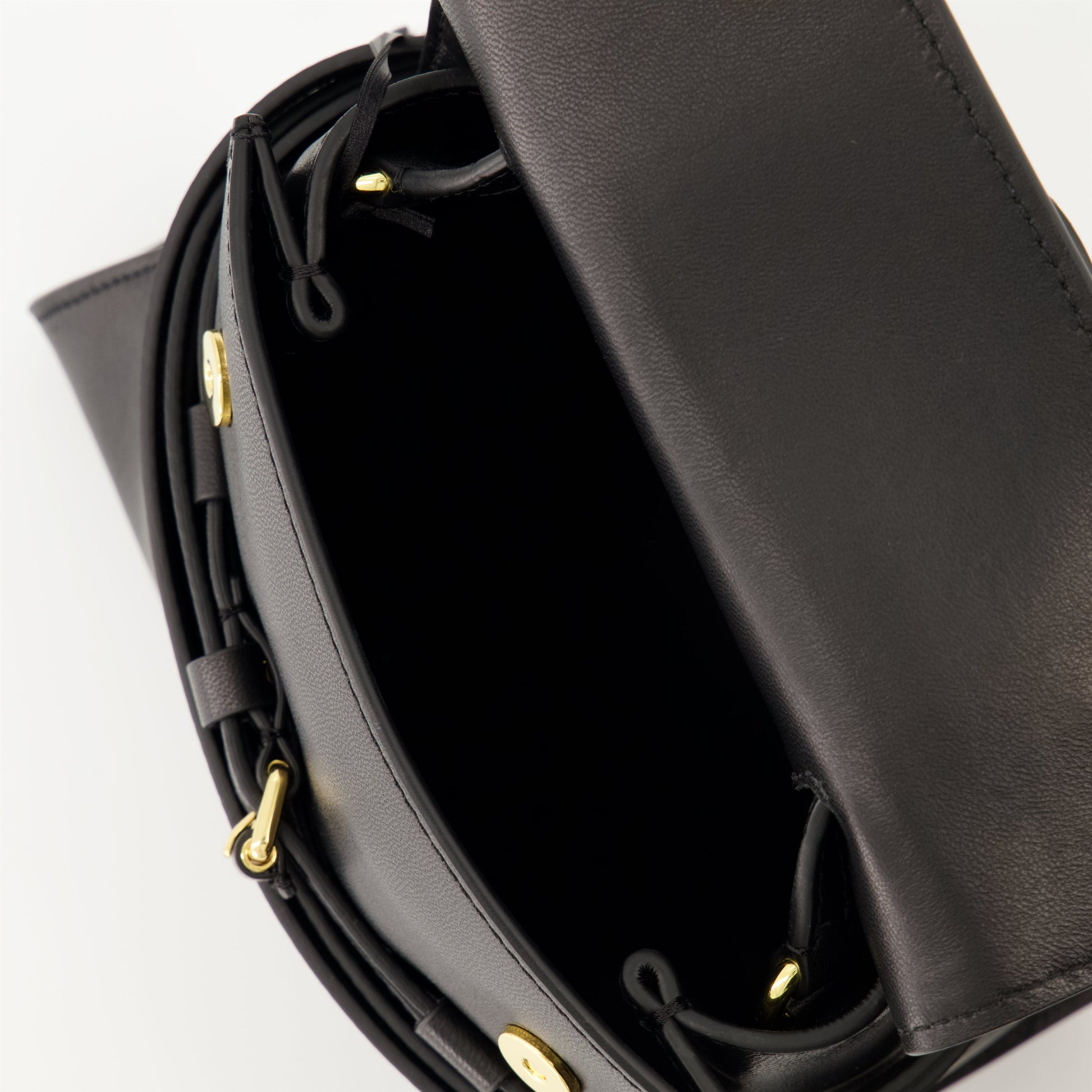 The black Tie Me small bag from Moschino is an elegant accessory for women. It is part of the Spring-Summer 2025 collection and is made of nappa lamb leather.