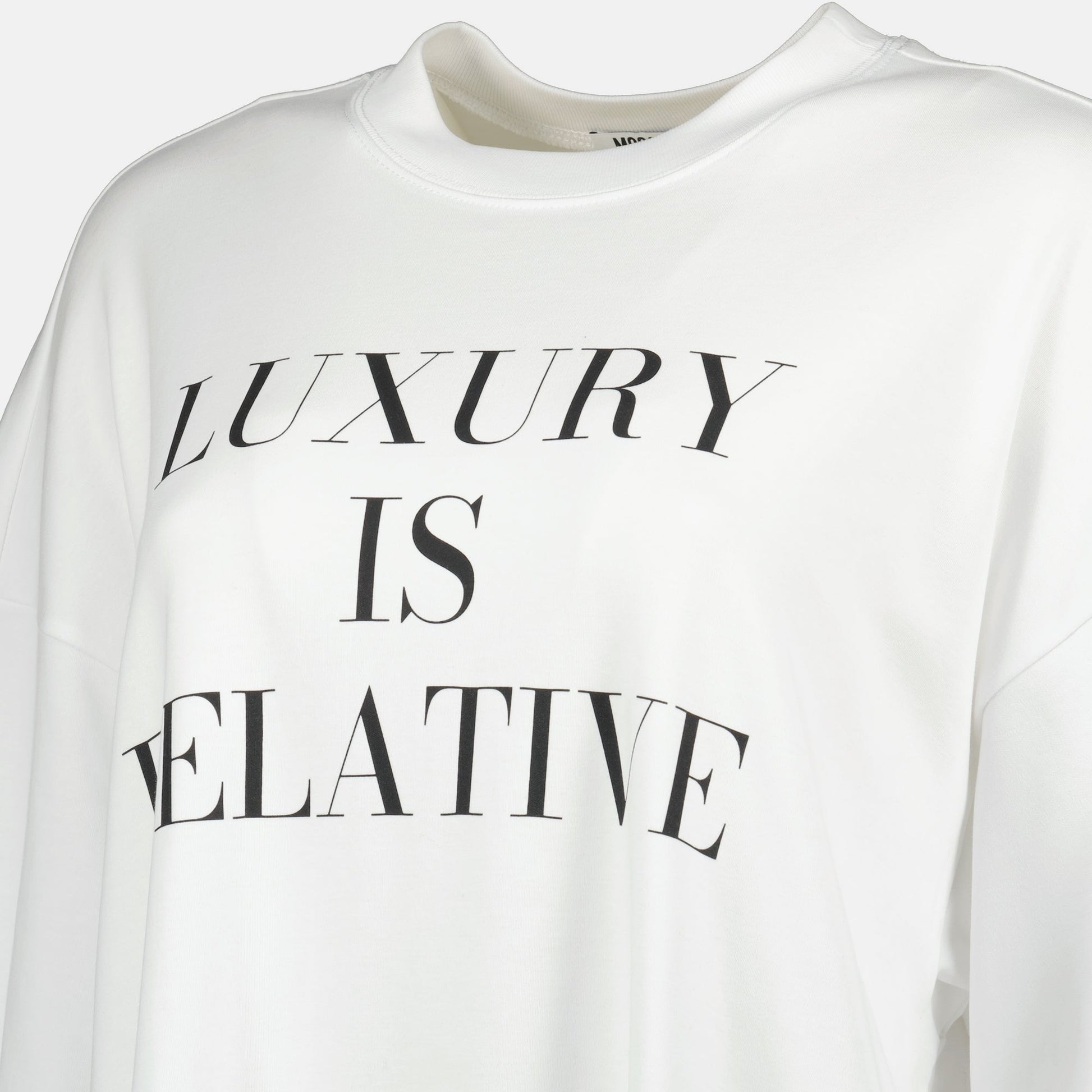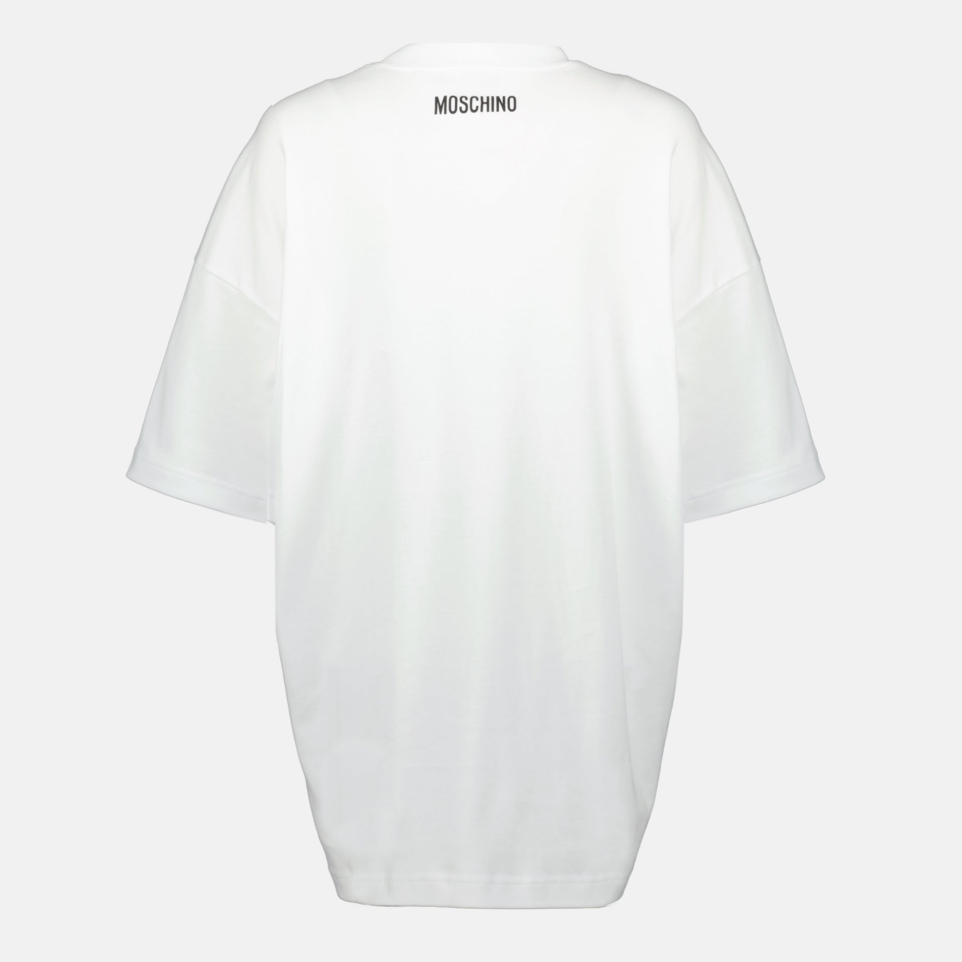 White printed t-shirt from the brand Moschino, designed for women. This model is part of the Autumn-Winter 2025 collection and features a round neck and short sleeves.