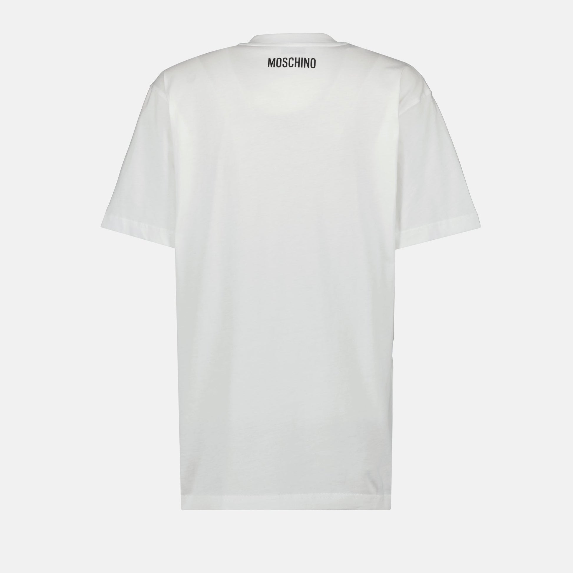 White printed T-shirt from the brand Moschino, designed for women. This model is part of the Autumn-Winter 2025 collection and features a round neck and a straight cut.