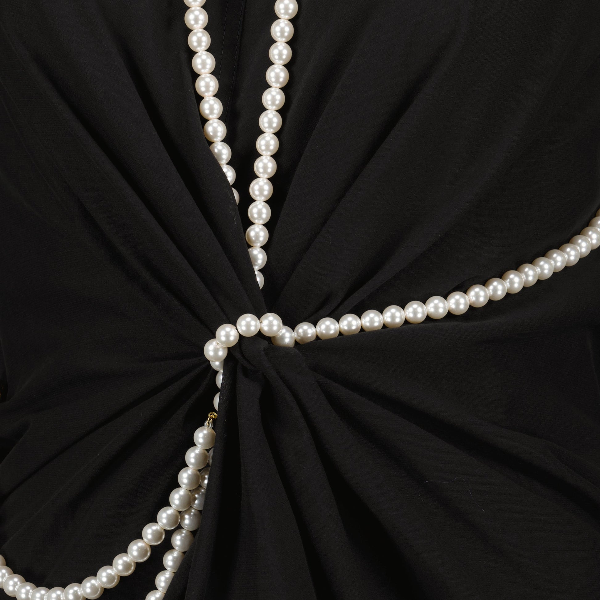 Beaded stretch top by Moschino for women from the Spring-Summer 2025 collection. This black model in cotton-silk features a round neck, a fitted cut, and a removable pearl necklace.