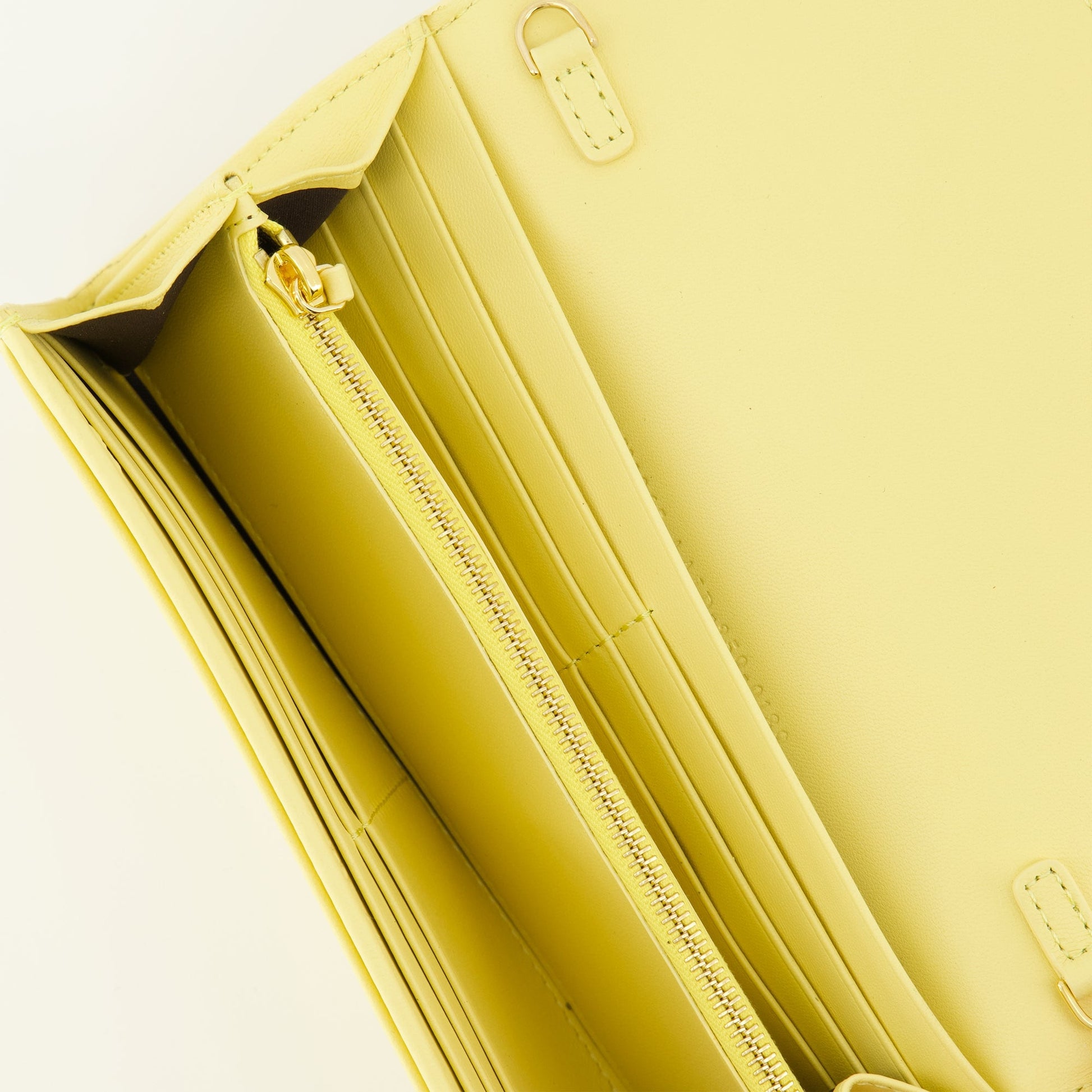 The yellow chain Baguette wallet from Fendi is designed for women. It is part of the Autumn-Winter 2025 collection and is made from lamb leather.
