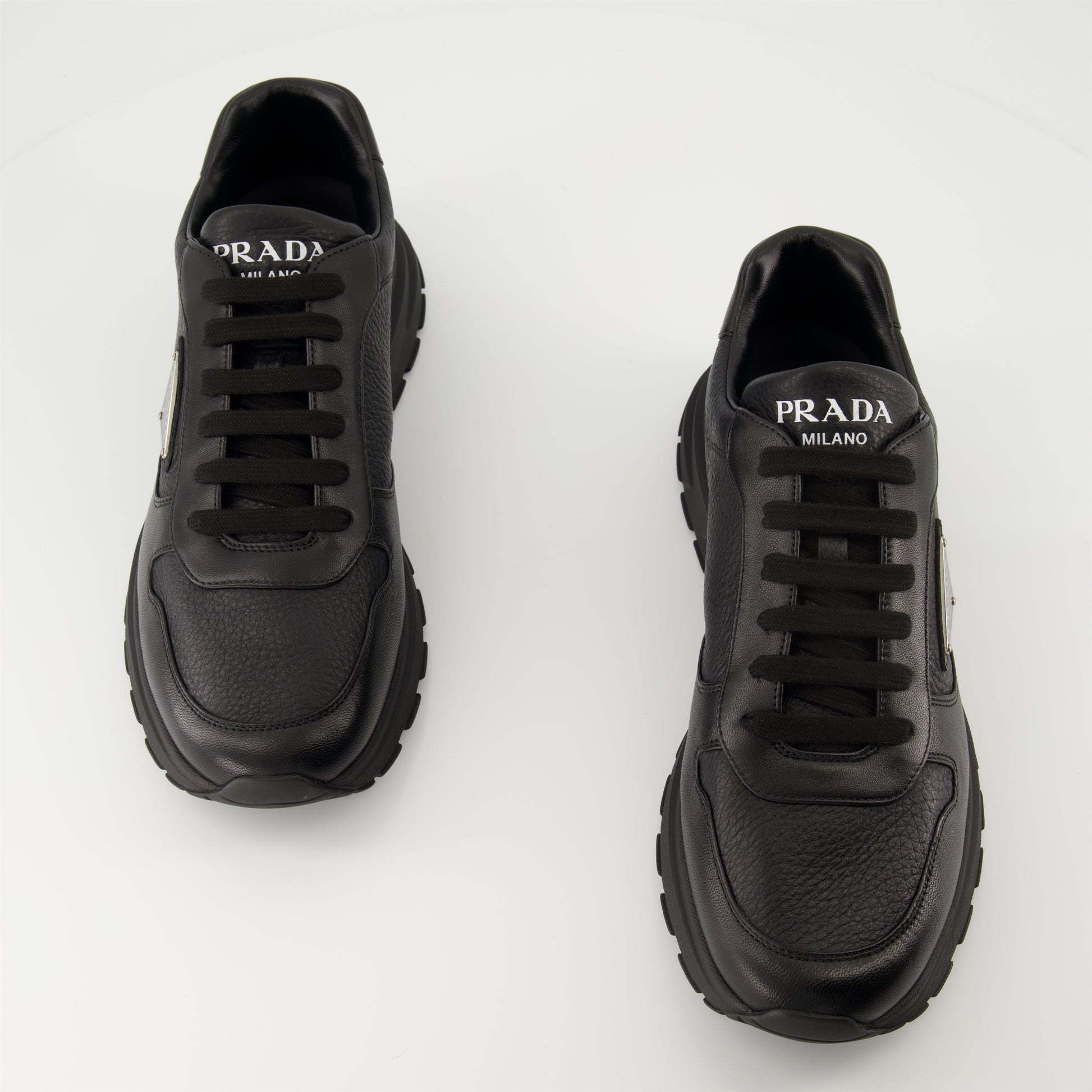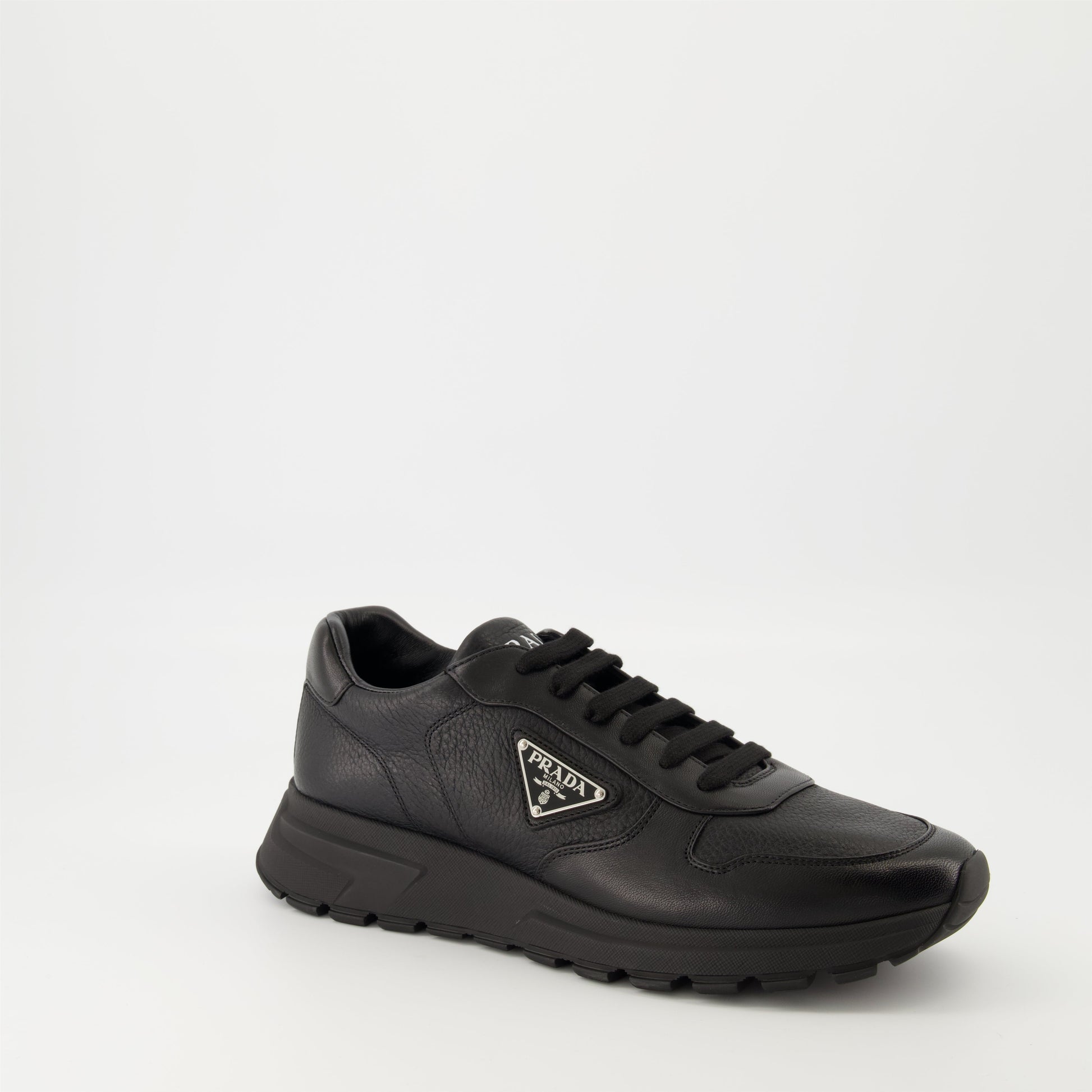 The Prax 01 leather sneakers from Prada are designed for men. They are part of the Spring-Summer 2025 collection and feature an elegant design in smooth black leather.