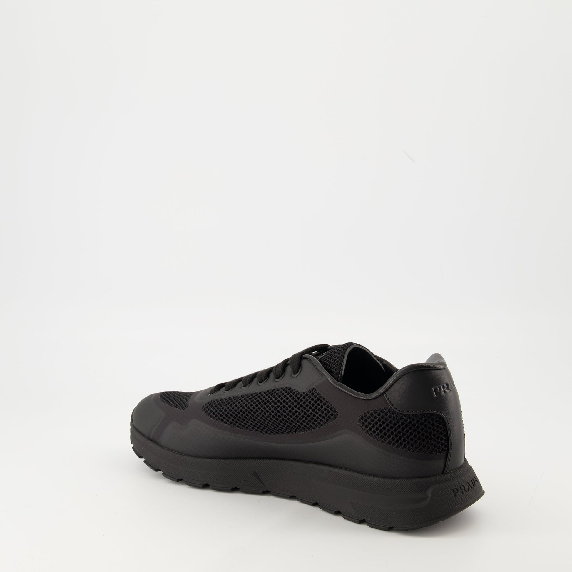 The black Prax 2.0 sneakers from Prada for men combine style and comfort. Part of the Autumn-Winter 2025 collection, they feature leather finishes and an iconic triangle logo.
