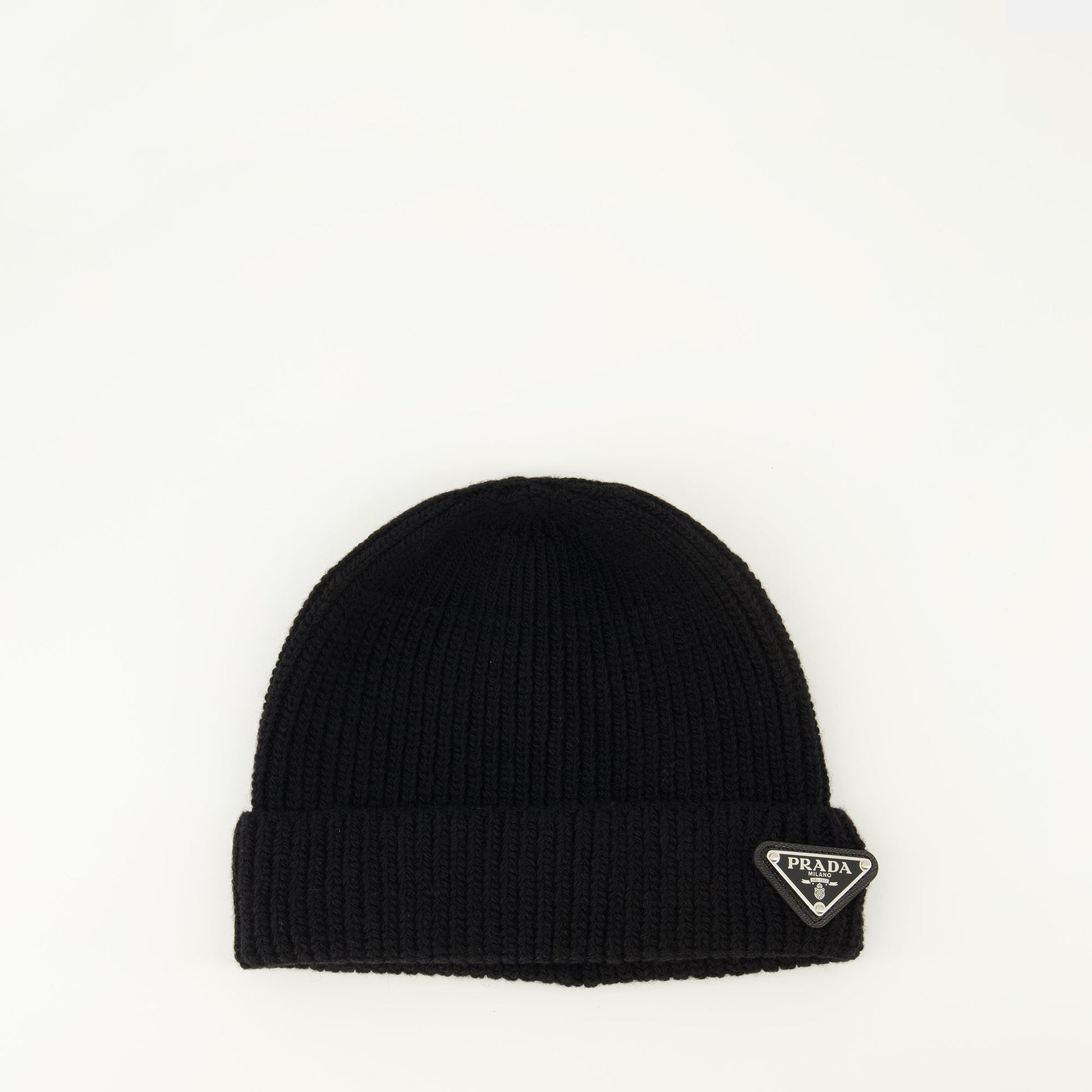The black wool beanie from Prada for men is a slip-on model. It is part of the Autumn-Winter 2025 collection and features an enameled metal triangle logo.