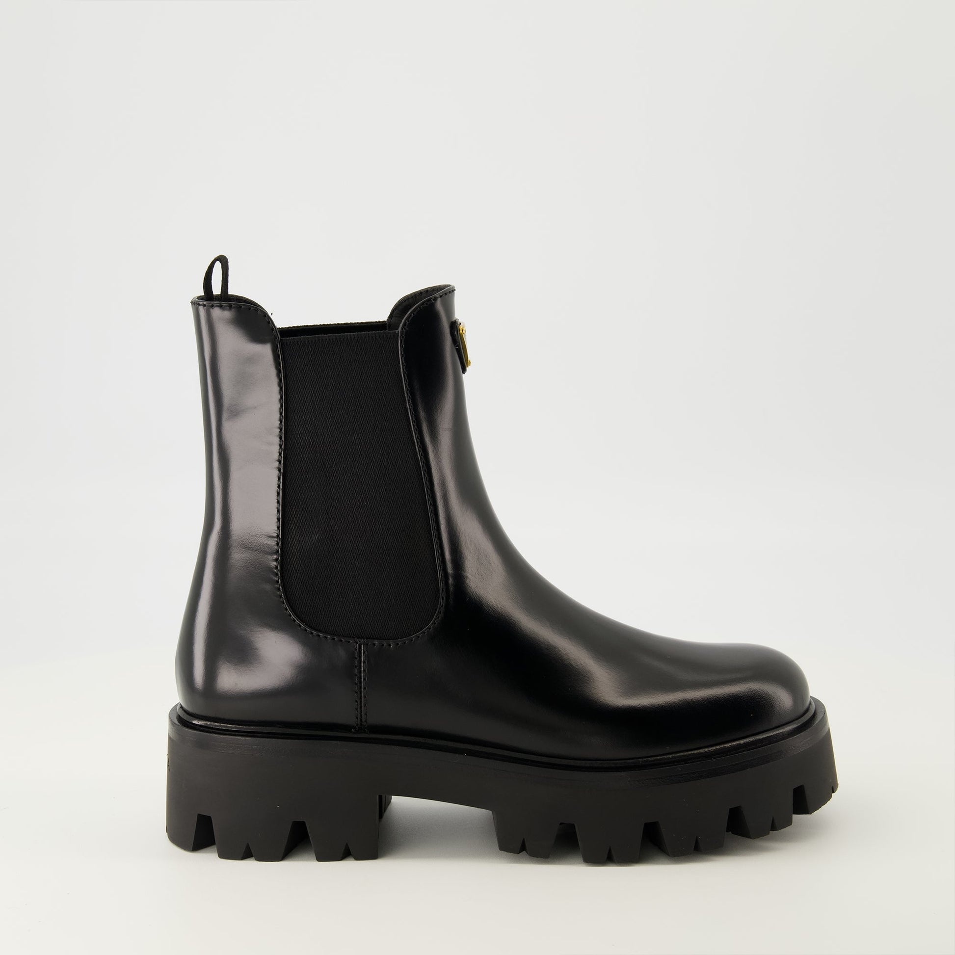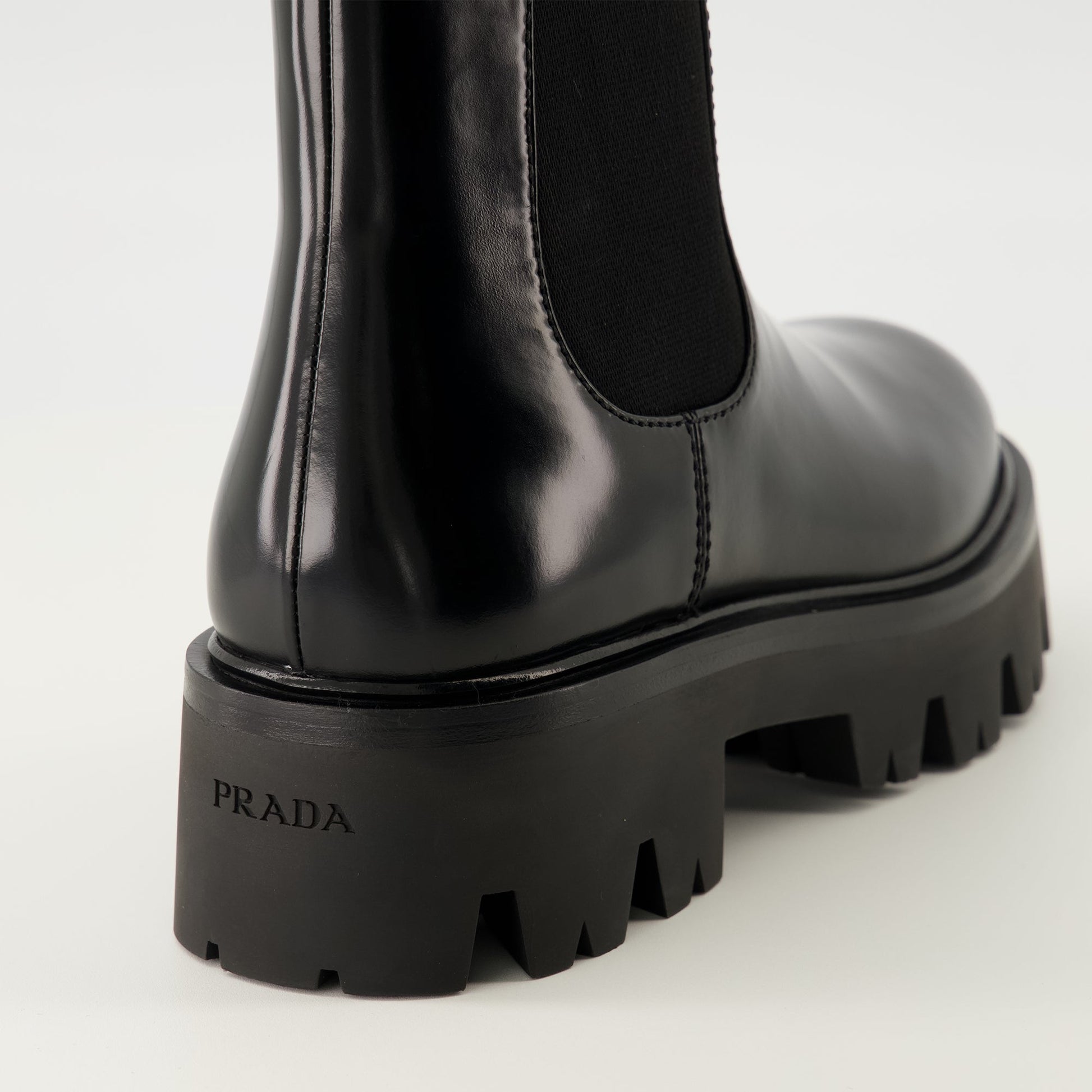 The black leather ankle boots from Prada for women are designed for the Autumn-Winter 2025 collection. They feature a slip-on design with a rounded toe and a rubber tread sole.