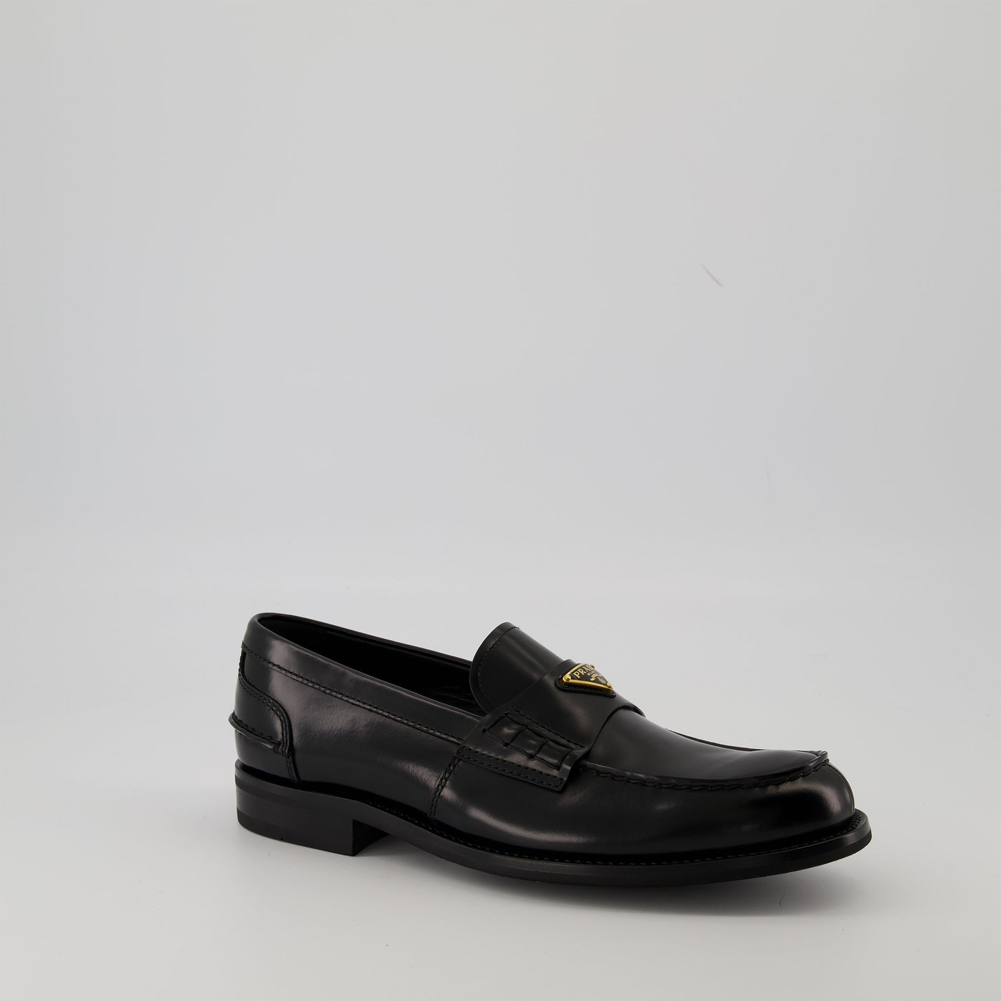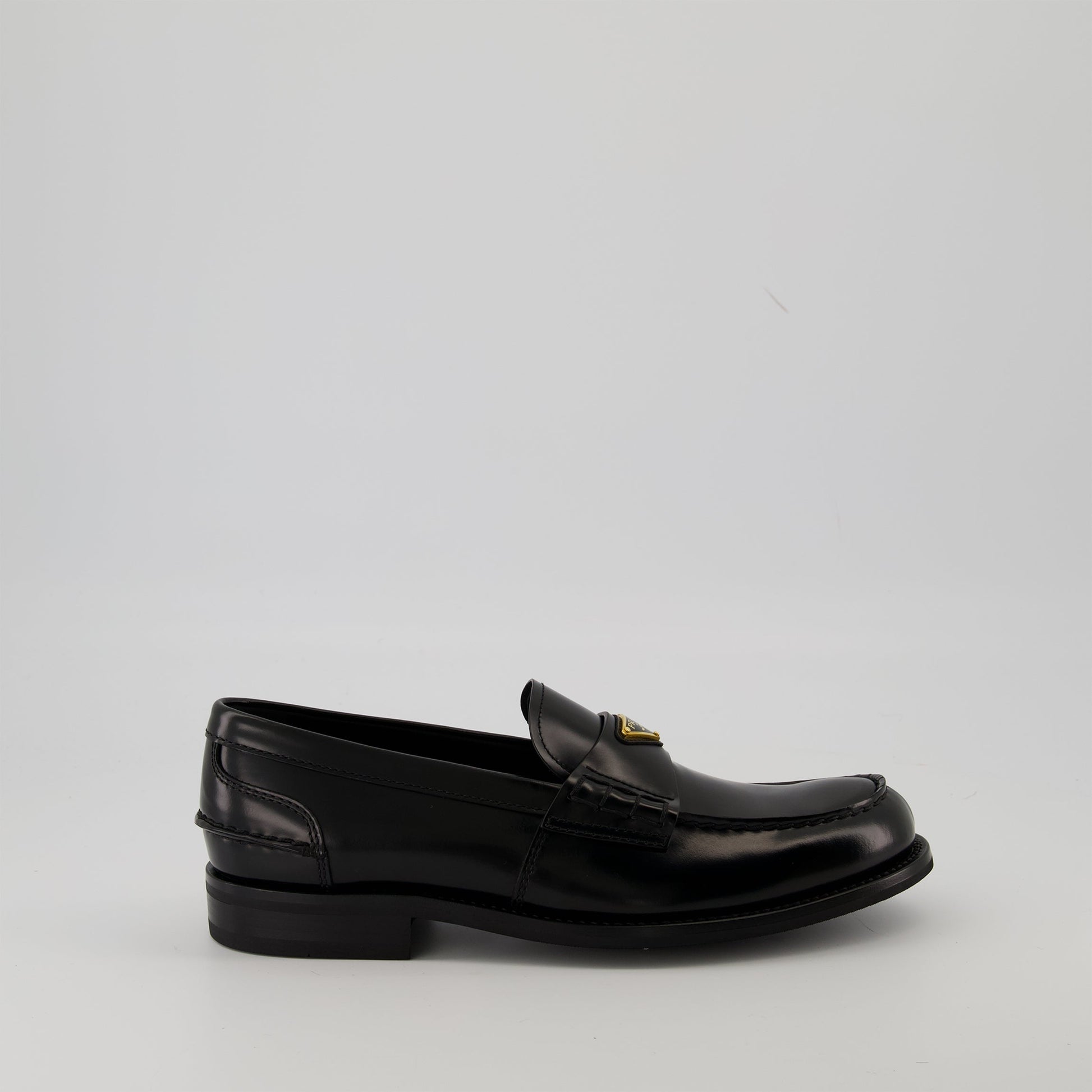 Black brushed leather loafers from Prada for men, Fall-Winter 2025 collection. They feature a slip-on design with a rounded toe and calf leather details.
