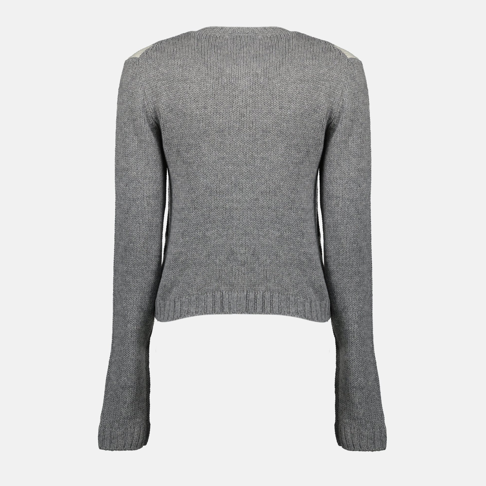 The plaid wool cardigan from Prada is a women's garment from the Autumn-Winter 2025 collection. It features a round neck, long sleeves, and an embroidered logo.