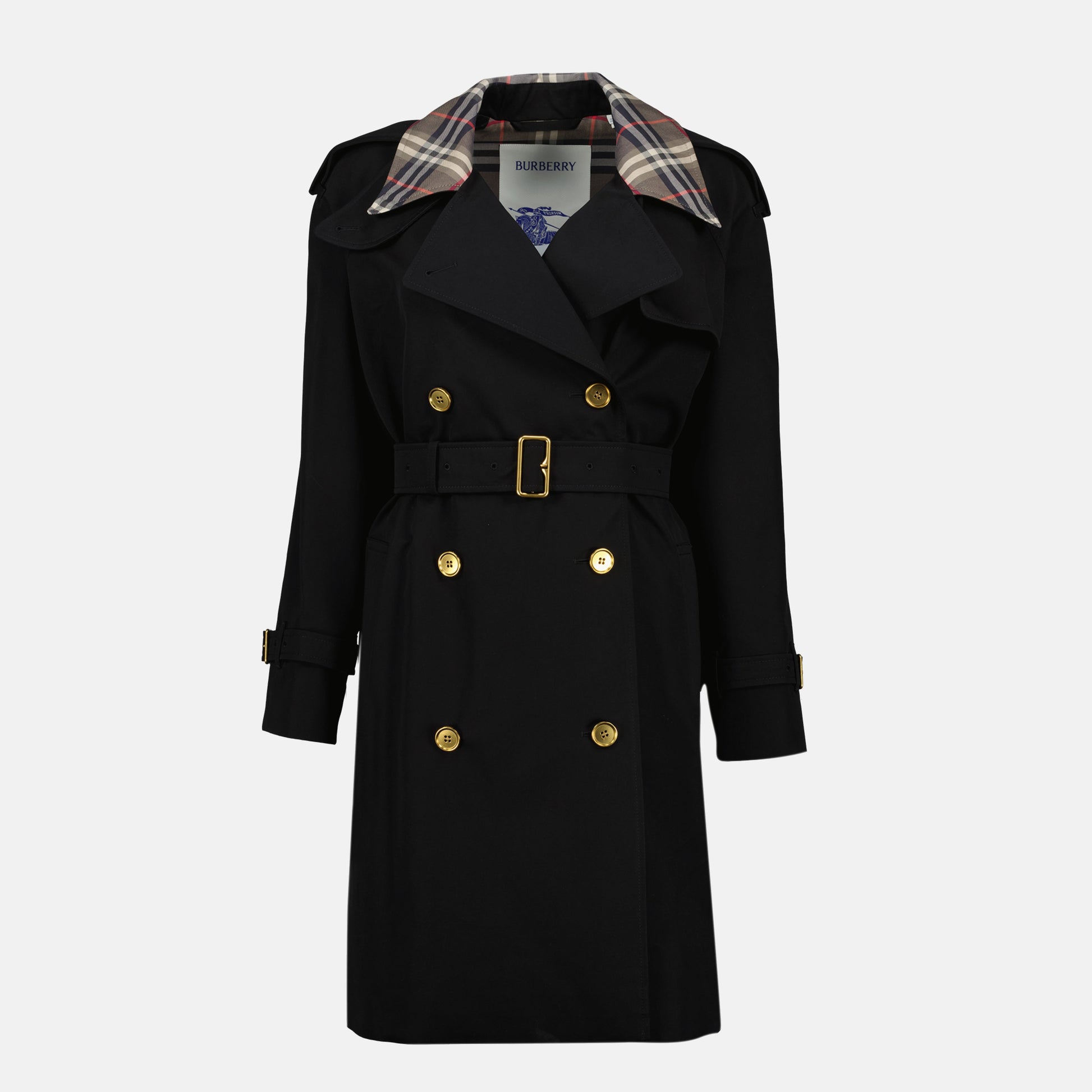 The black Castleford mid-length trench coat from Burberry is a women's garment from the Autumn-Winter 2025 collection. It is crafted from cotton and viscose with a classic collar and elegant details.