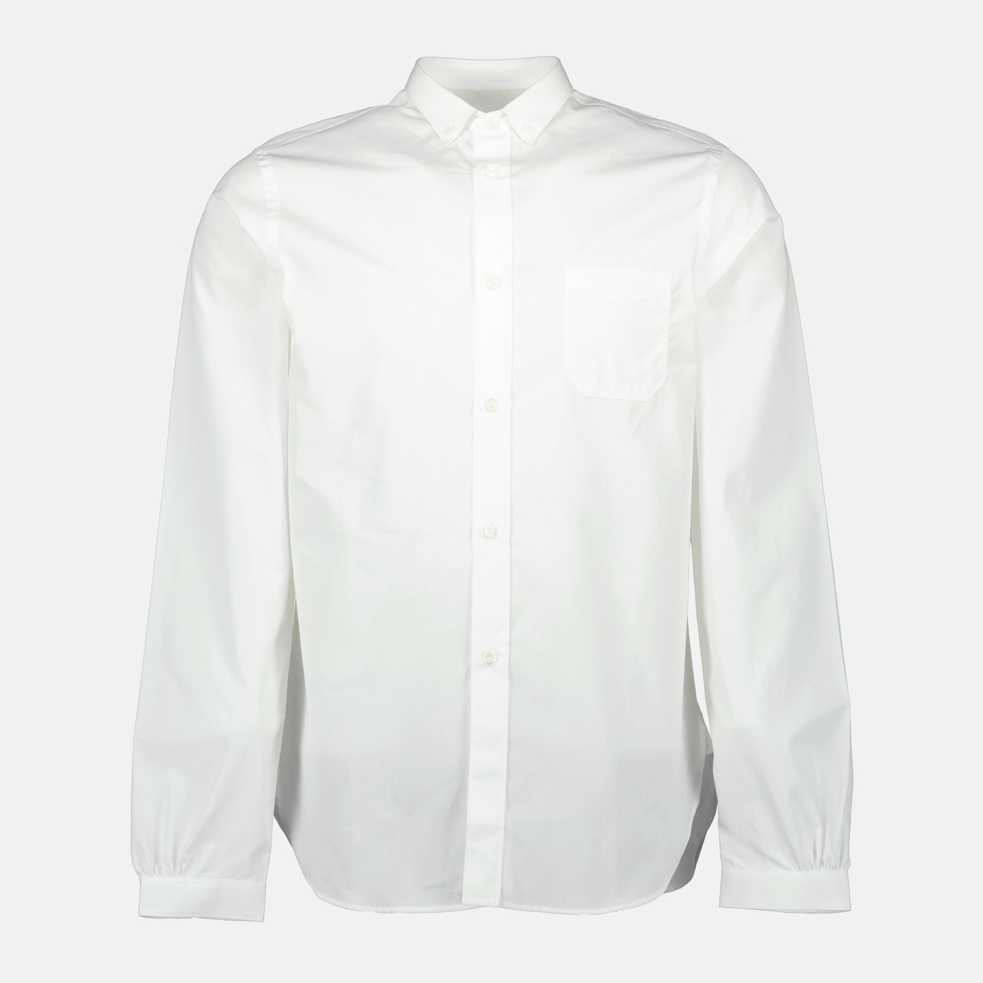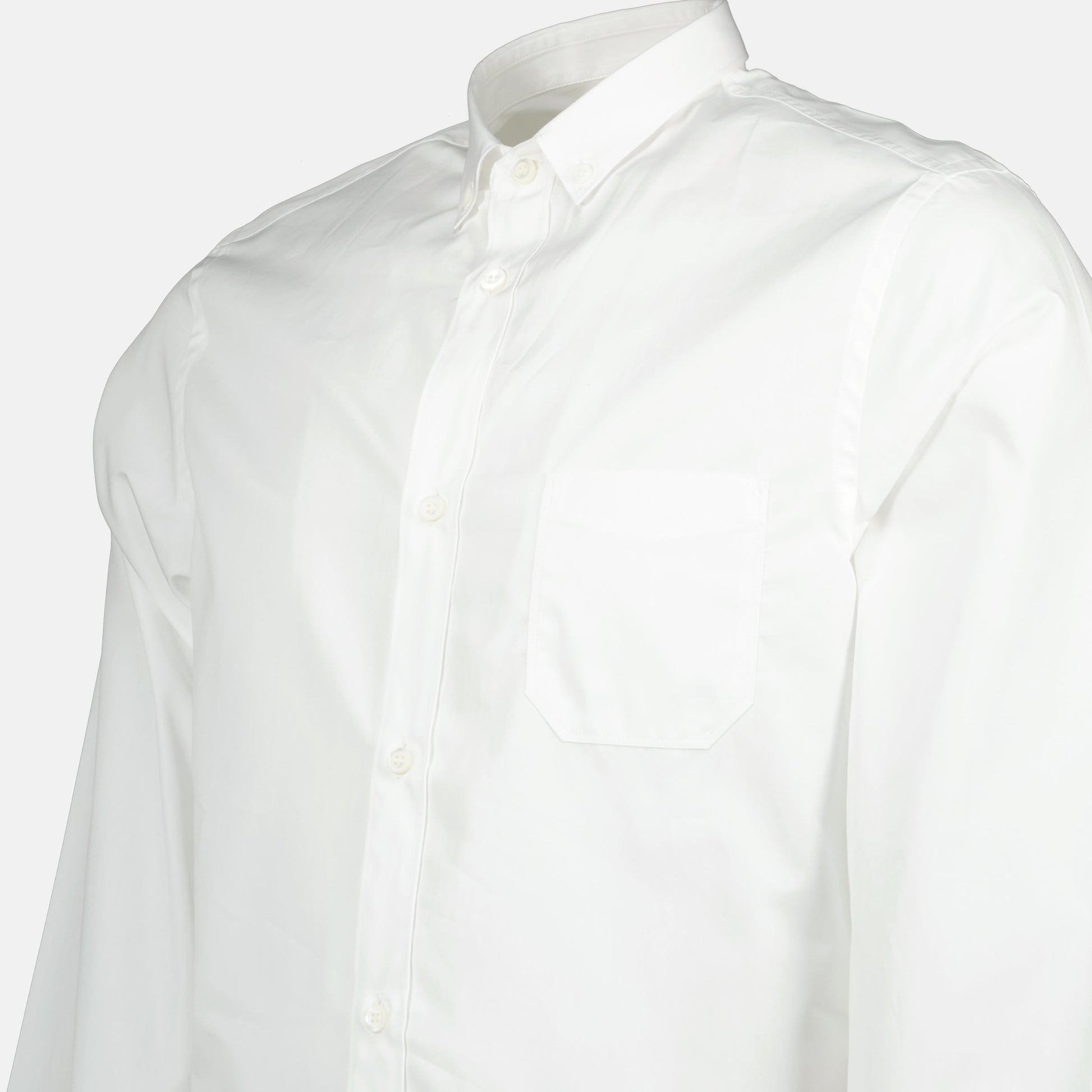 White cotton shirt by Prada for men. Part of the Autumn-Winter 2025 collection, it features a classic collar, long sleeves, and a triangle logo.