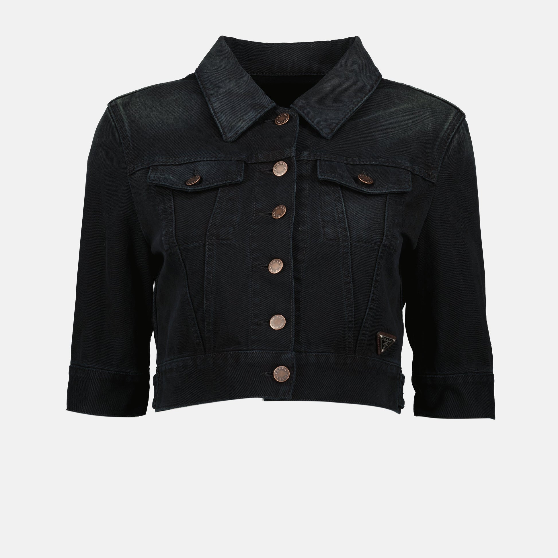 Cropped denim jacket by Prada for women, made from faded black denim. This piece is part of the Spring-Summer 2025 collection and features a short cut and refined details.