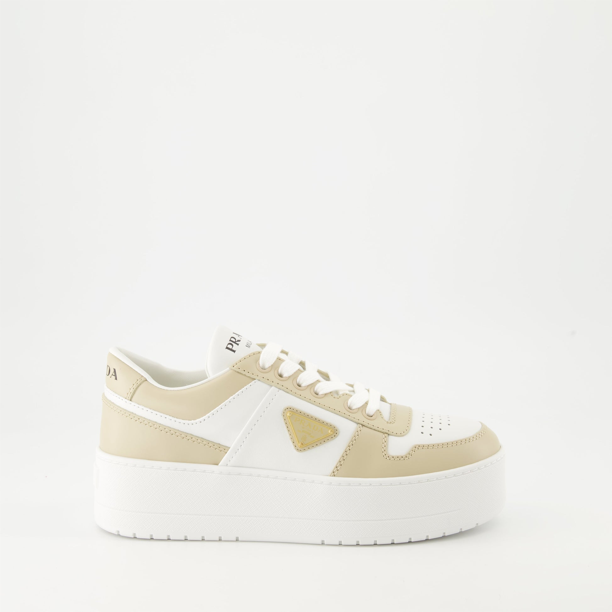 Downtown platform sneakers from the Prada Fall-Winter 2024 collection for Women. Made from smooth leather. Two-tone design. Round toe and platform sole.