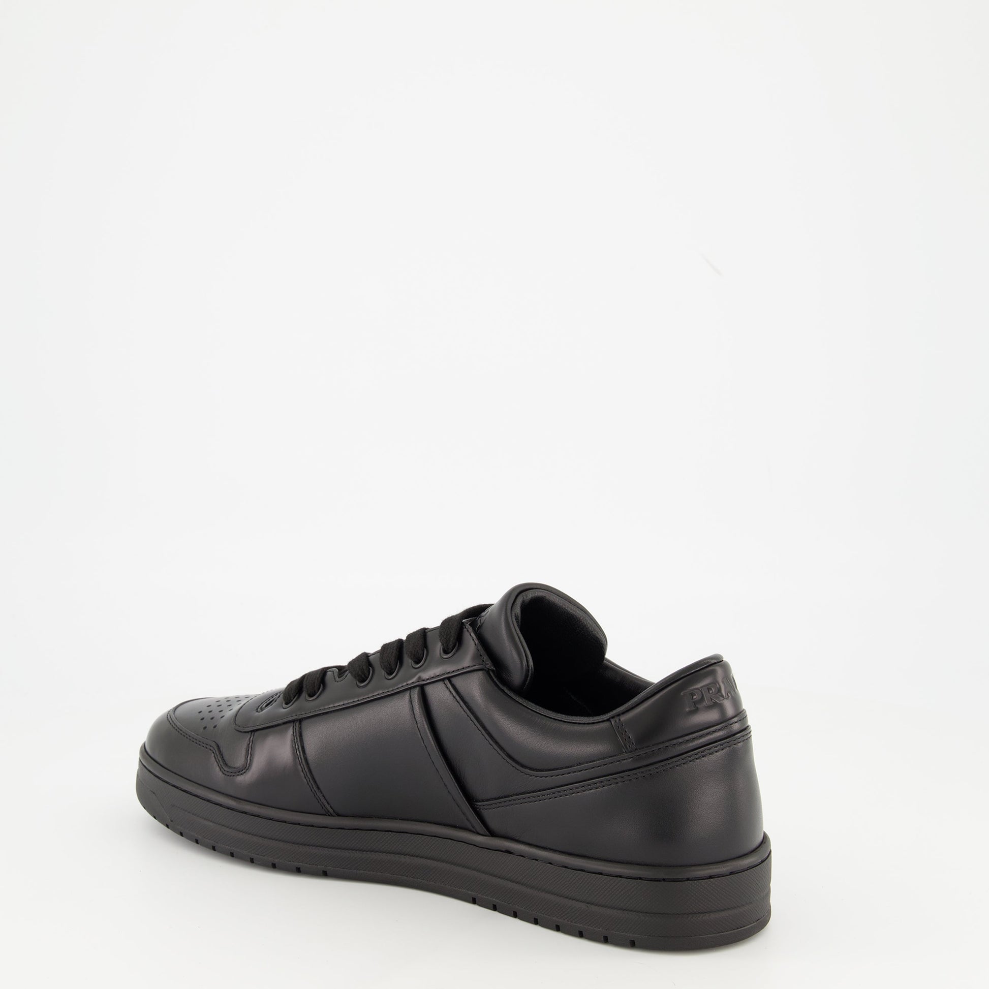 Downtown sneakers in black leather from Prada for men, combining elegance and comfort. This pair is part of the Autumn-Winter 2025 collection, featuring refined details in lambskin.