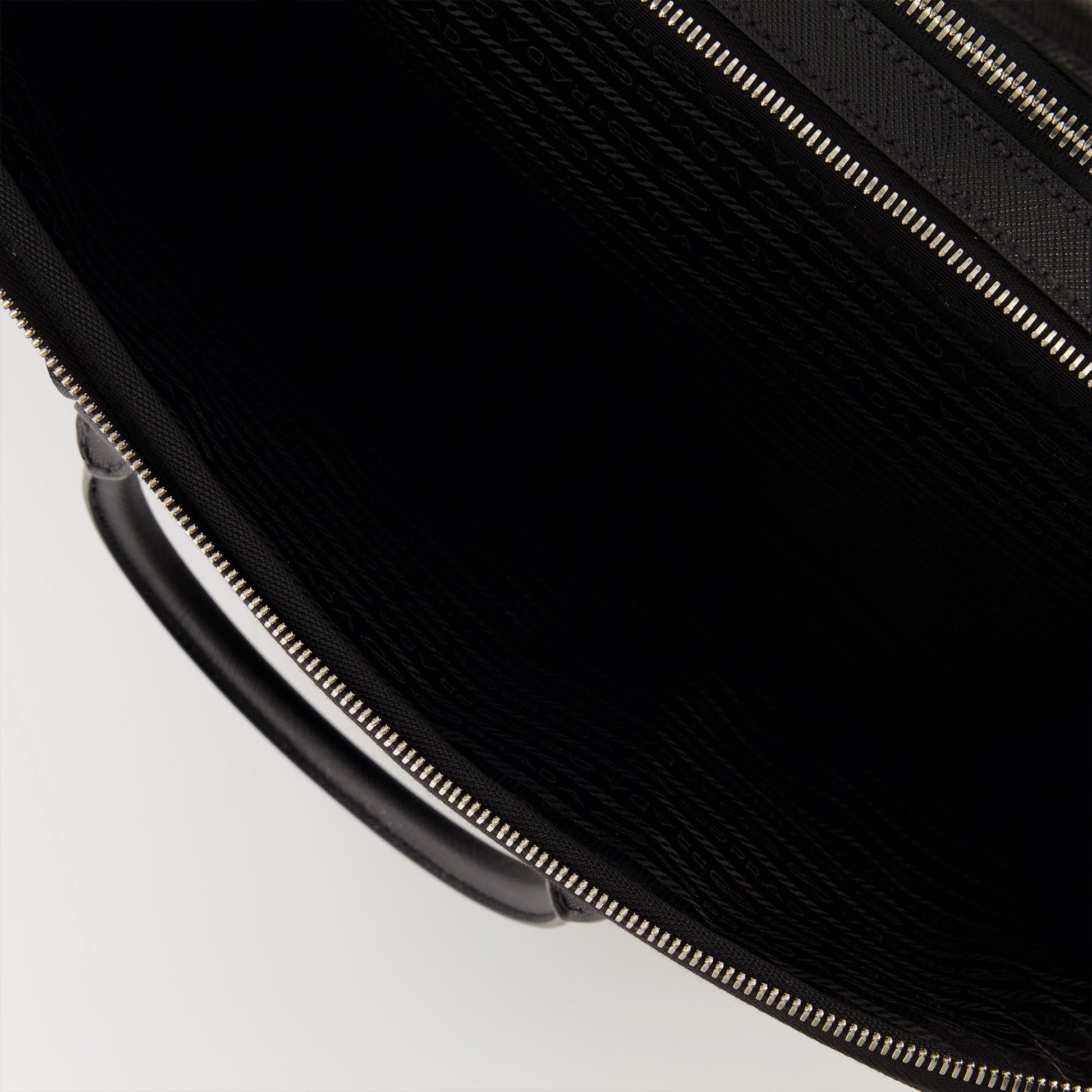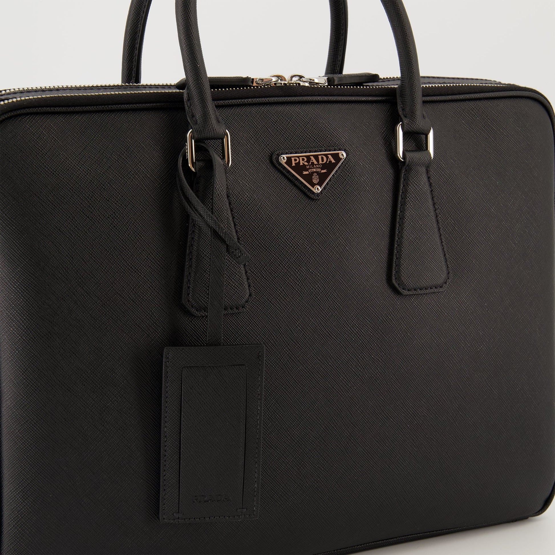 The black Saffiano leather briefcase from Prada is an elegant accessory for men. Part of the Autumn-Winter 2025 collection, it combines style and functionality.
