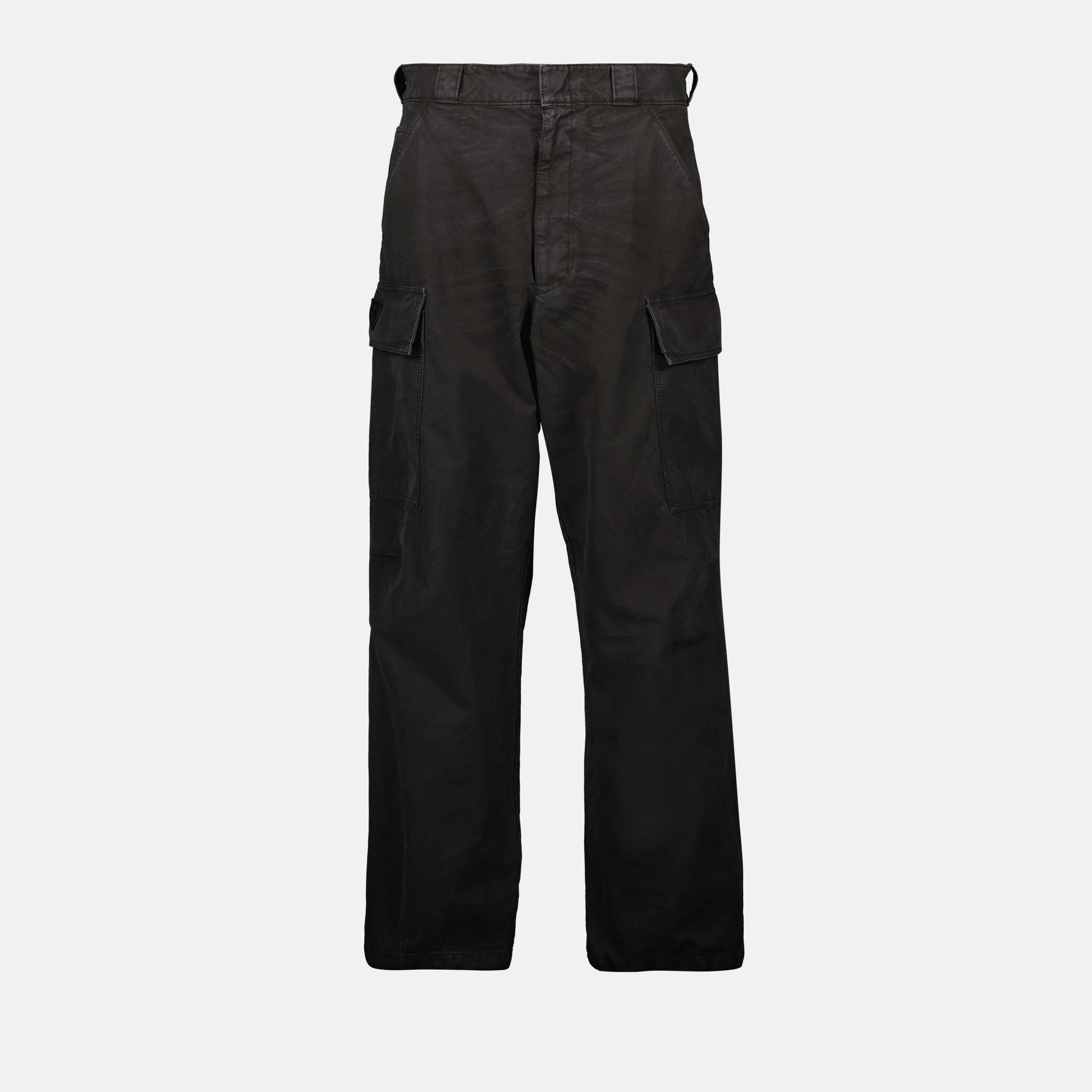 Black washed cargo pants from the brand Prada for men. This model is part of the Spring-Summer 2025 collection and is made from cotton with a classic cargo cut.
