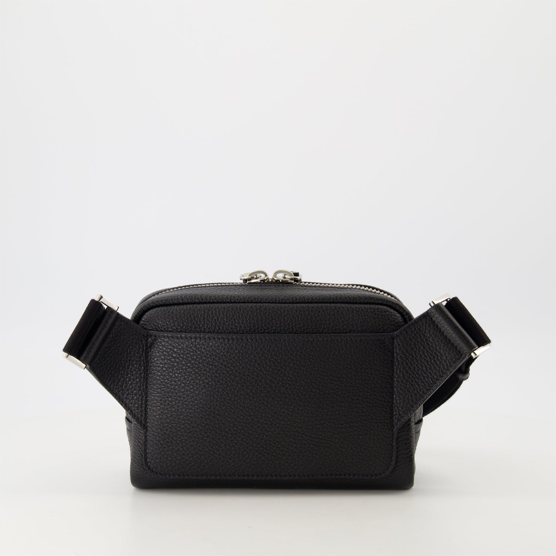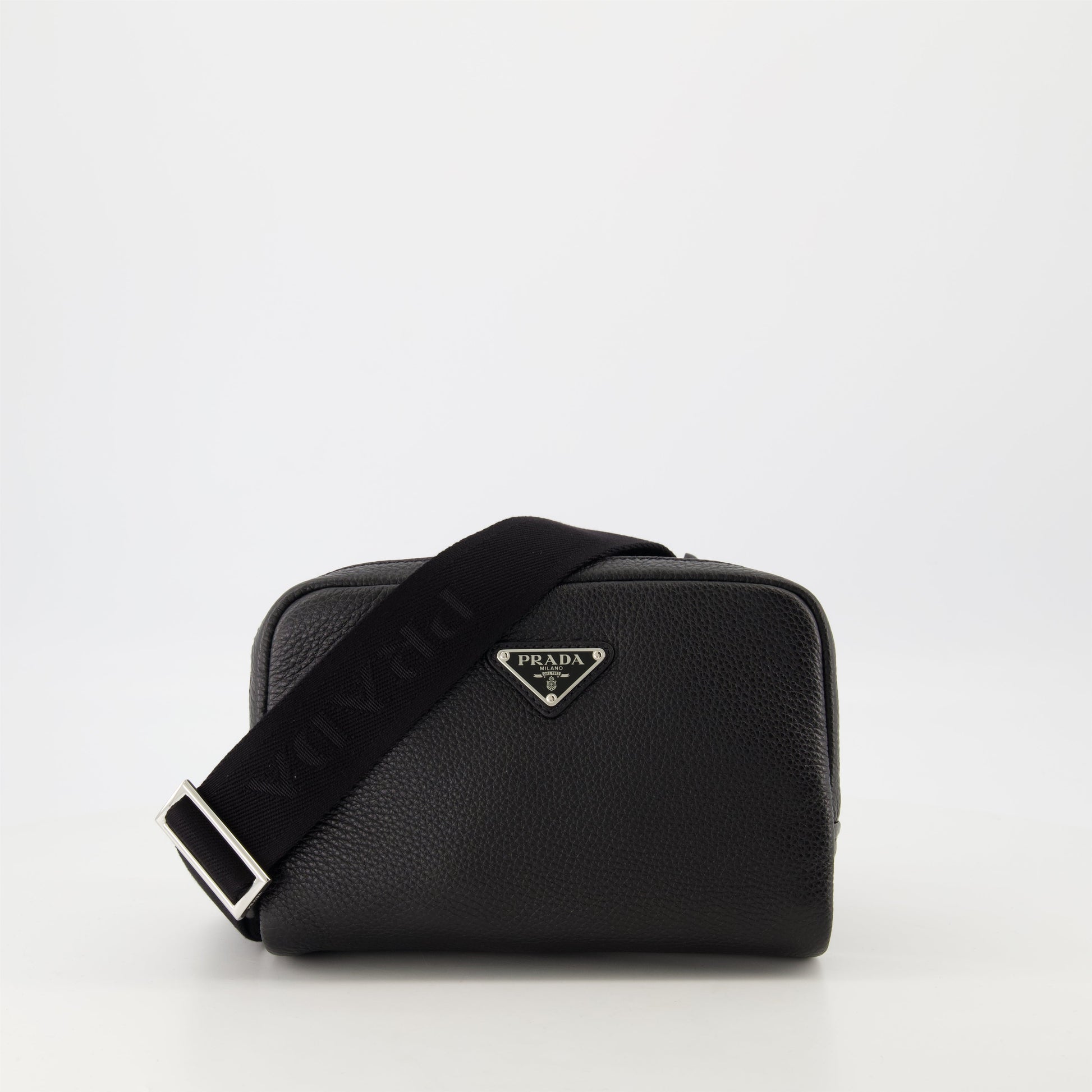 Textured leather shoulder bag by Prada, designed for men, Spring-Summer 2025 collection. It features a double-slider zip closure and an enameled metal triangle logo.