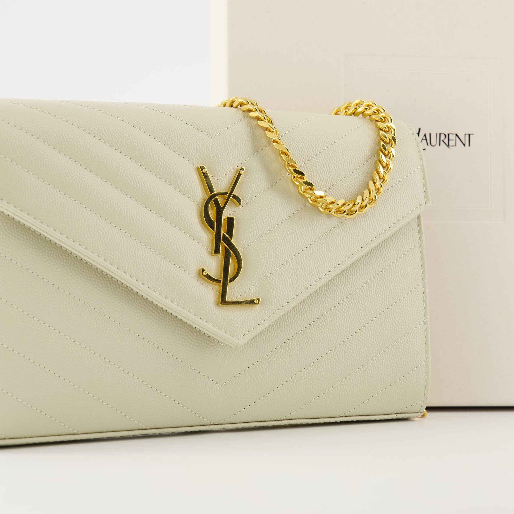 The white Cassandre chain wallet from Saint Laurent is an elegant feminine accessory. Part of the Autumn-Winter 2025 collection, it combines luxury and functionality.