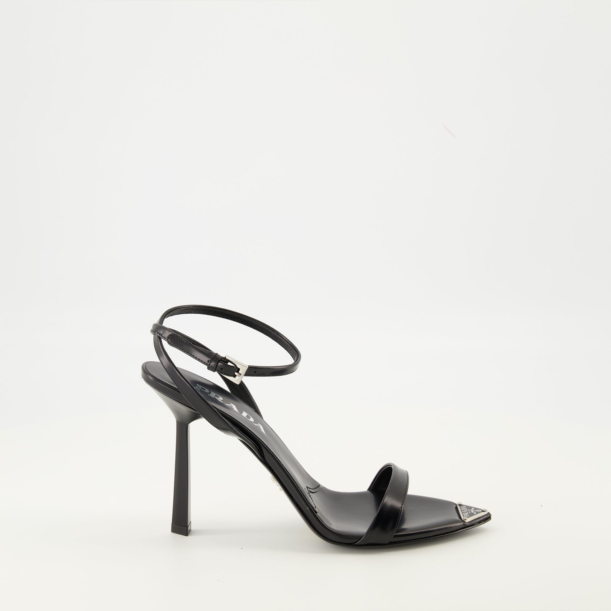 These heeled leather sandals by Prada for women combine elegance and comfort. From the Autumn-Winter 2025 collection, they feature a refined design with patent leather details.