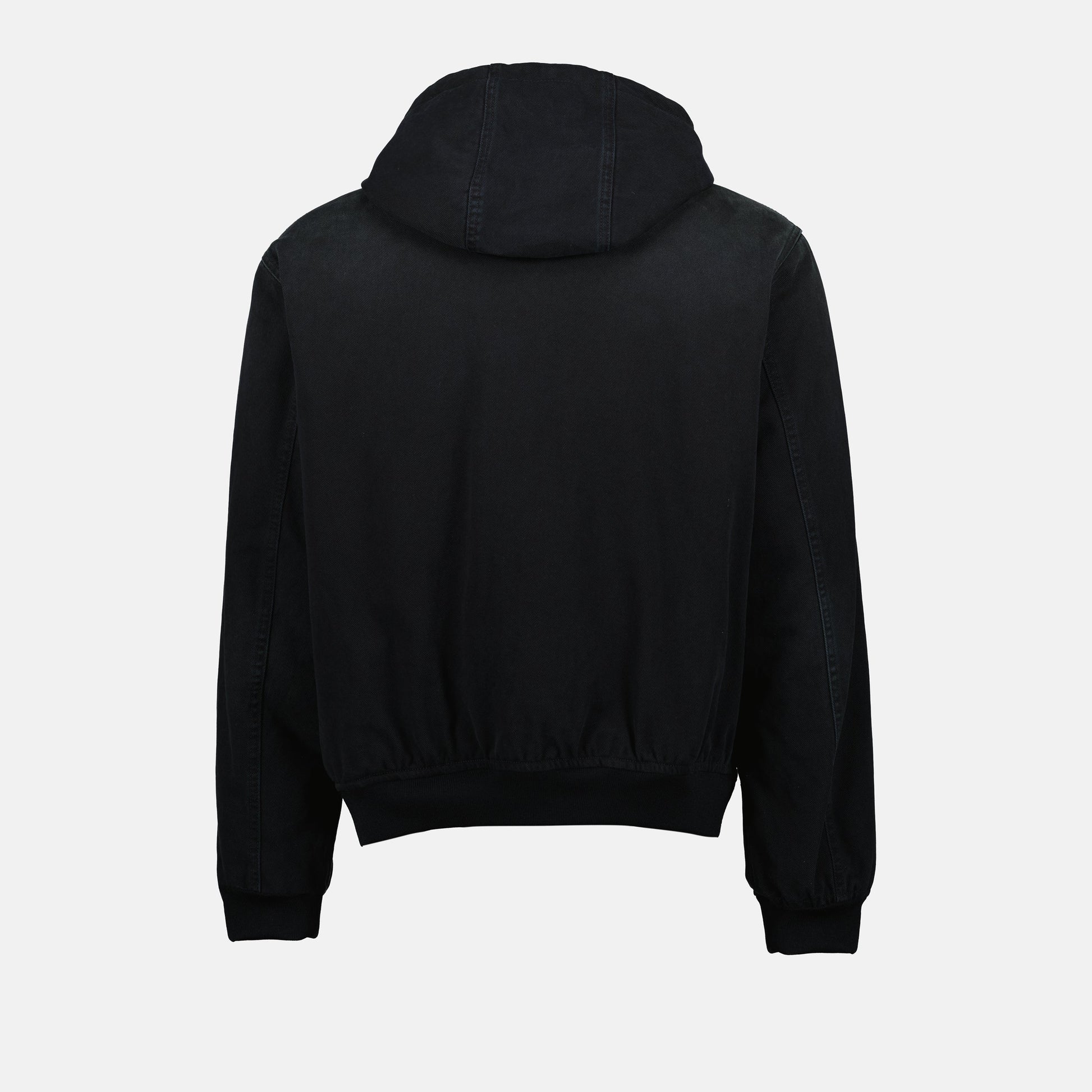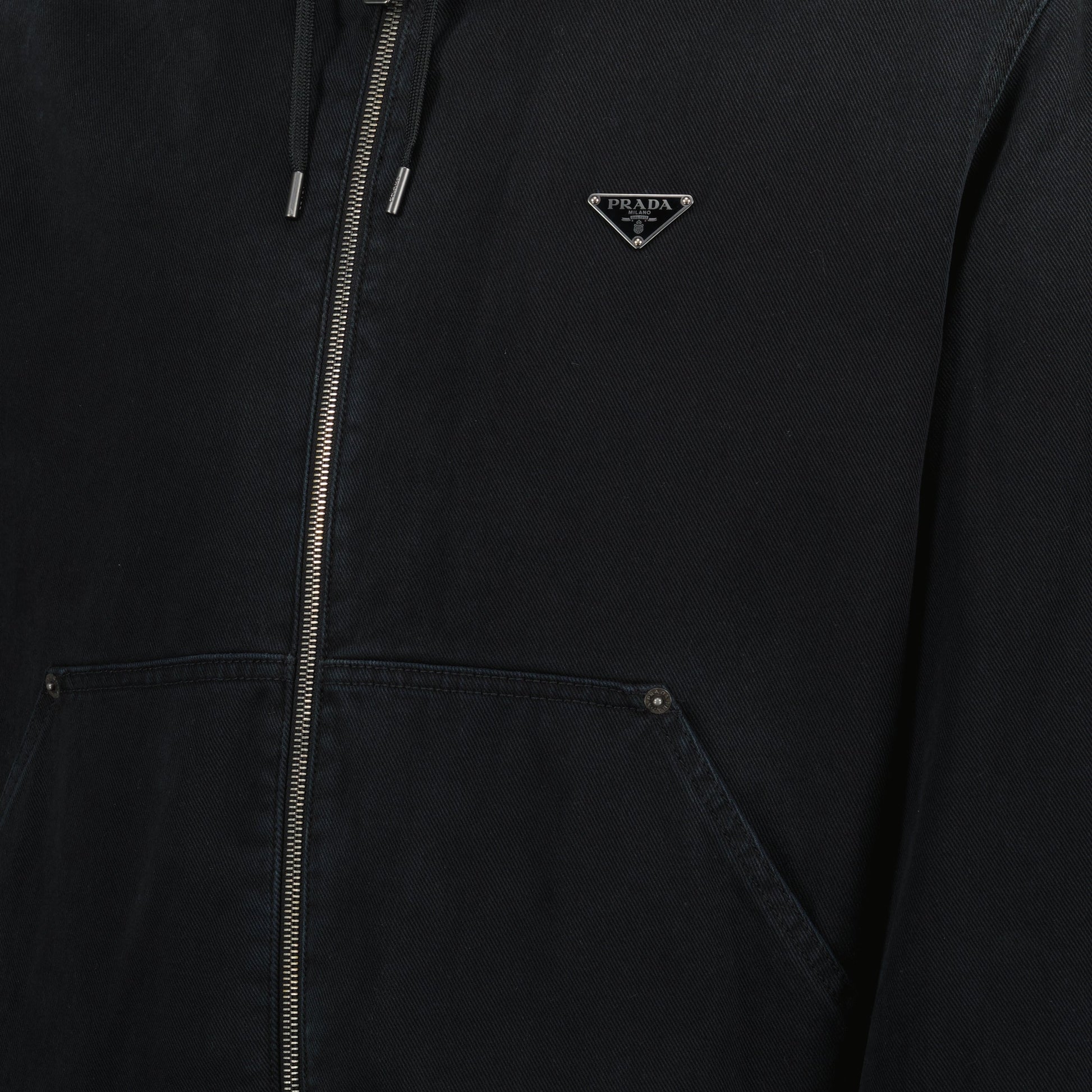 Black hooded jacket from Prada for men, made from cotton. It is part of the Spring-Summer 2025 collection and features a modern design with functional details.