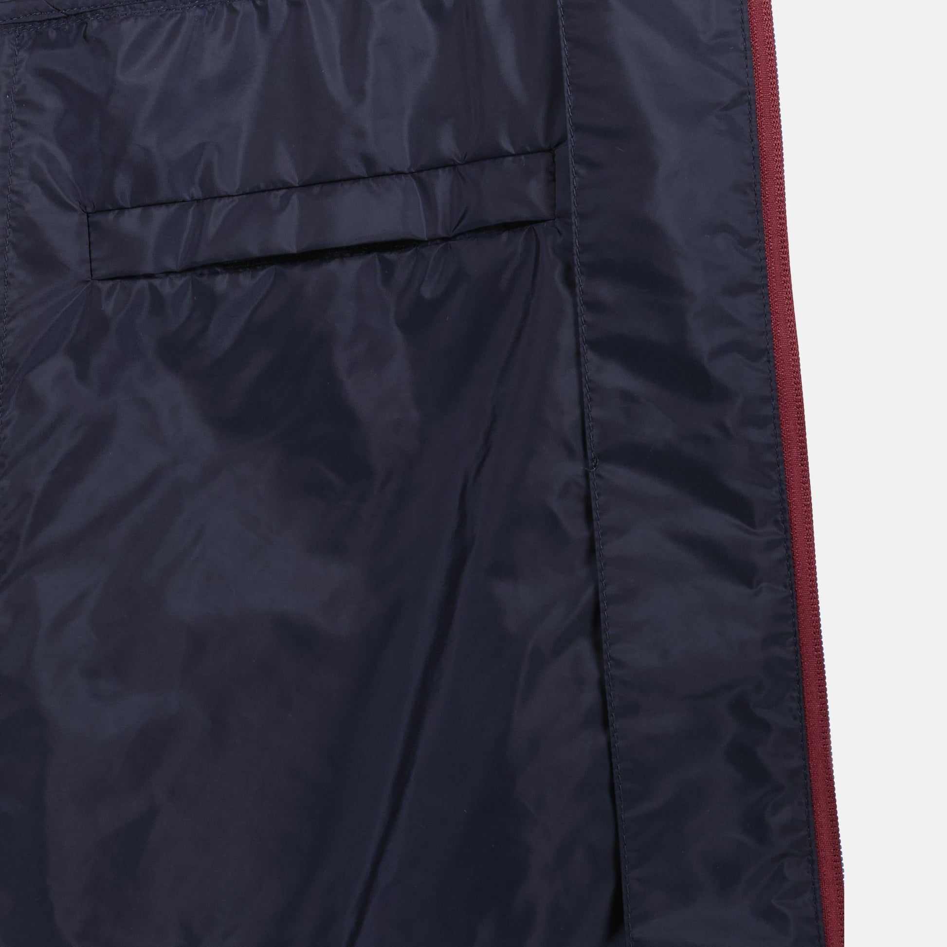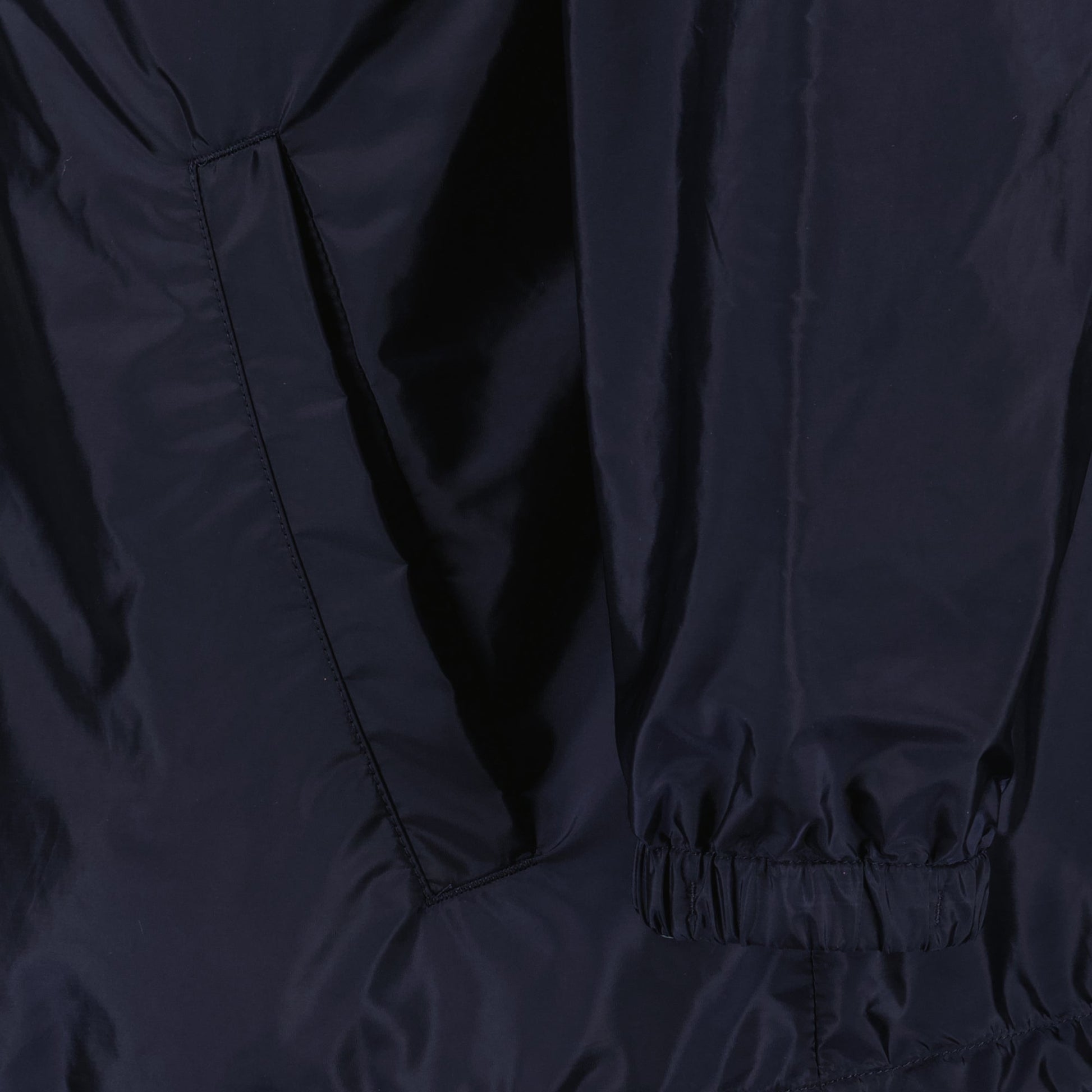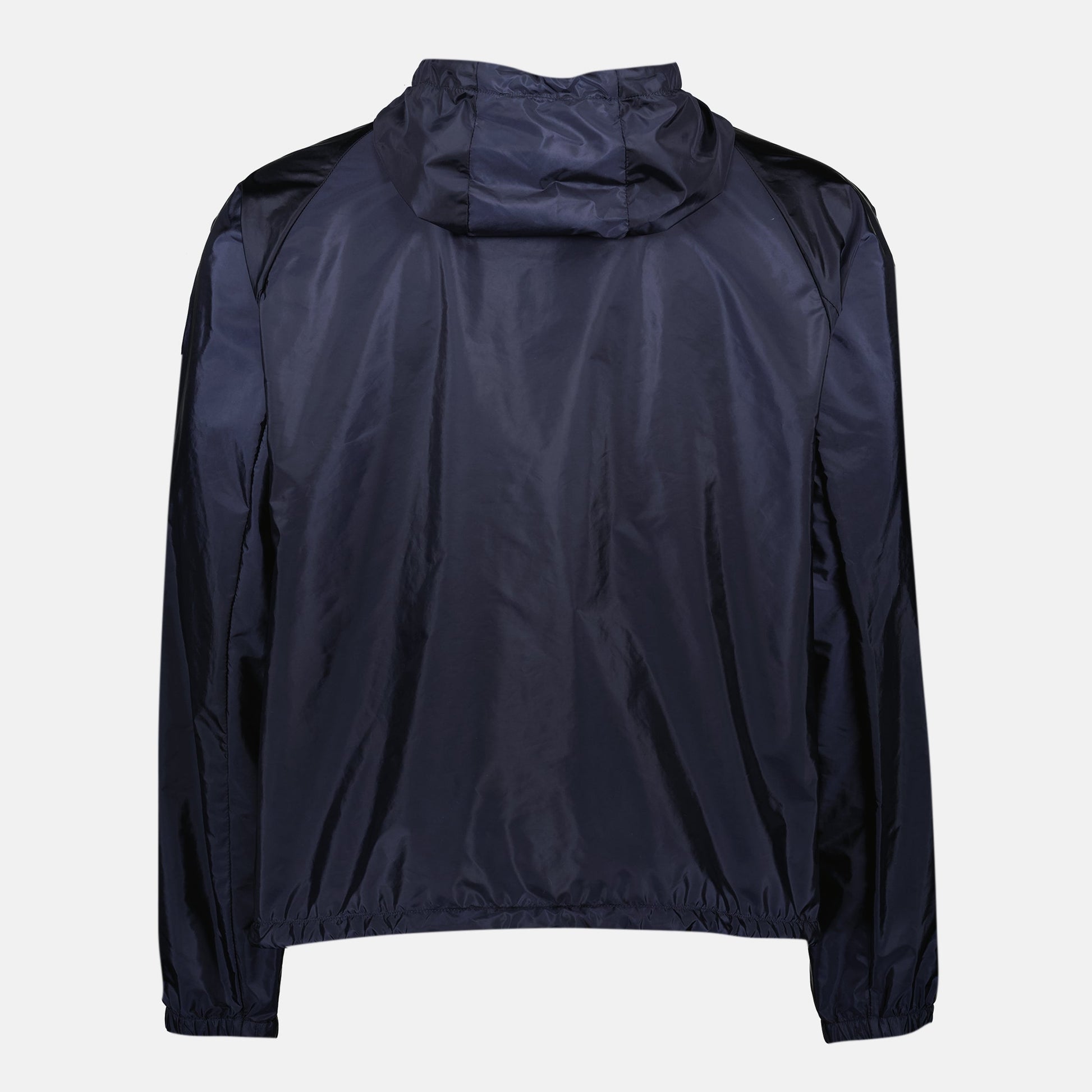Blue navy Re-nylon jacket by Prada for men, Fall-Winter 2025 collection. It features a high collar, a zip closure, and is made from recycled nylon.