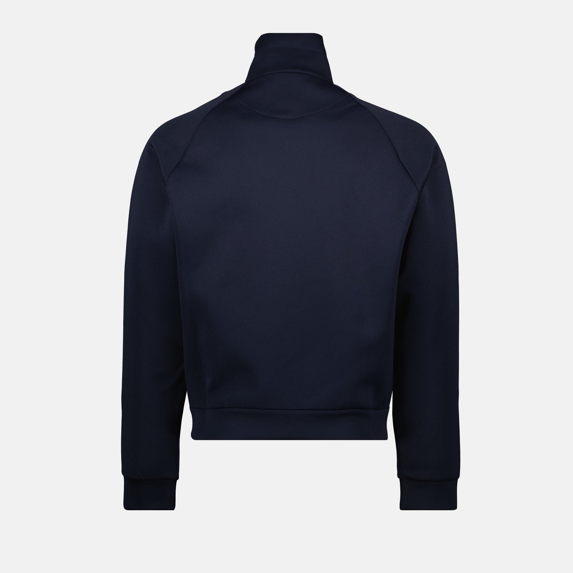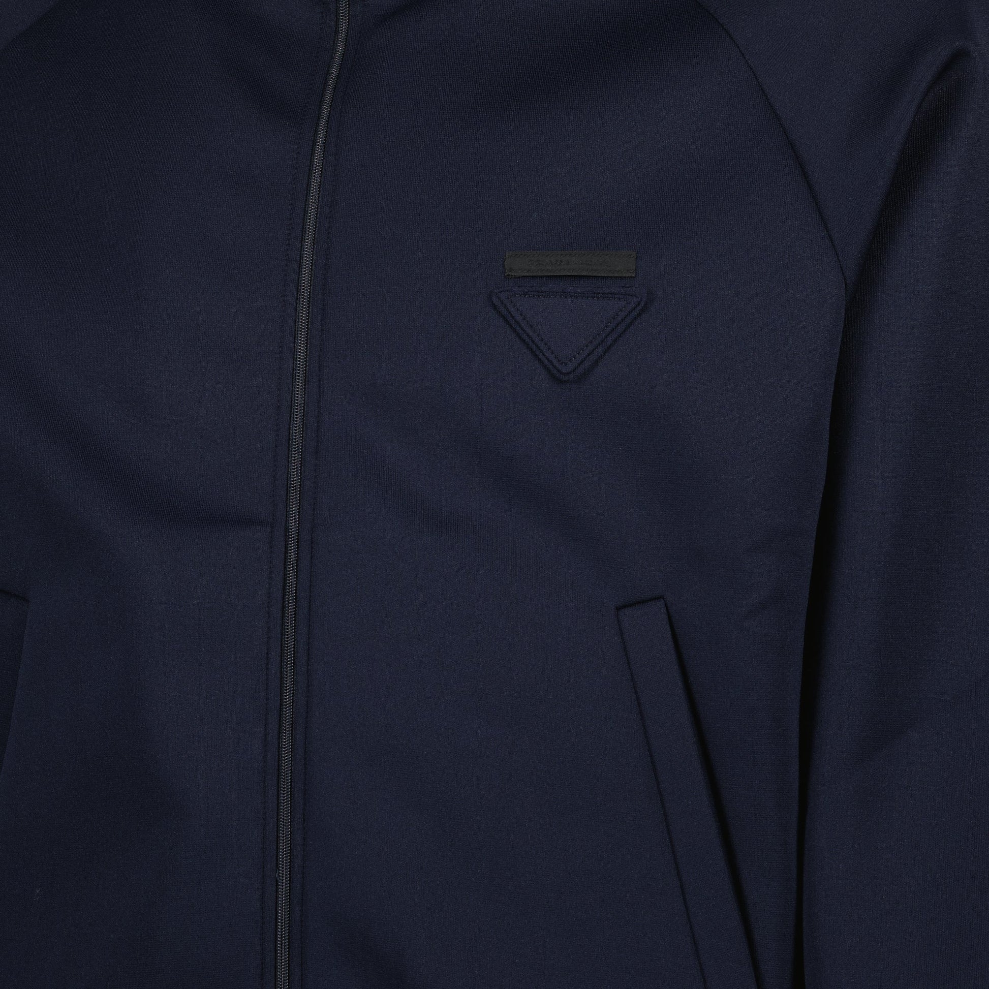 The zipped jacket in technical fabric by Prada is designed for men. It is part of the Autumn-Winter 2025 collection and is available in navy blue with elegant details.