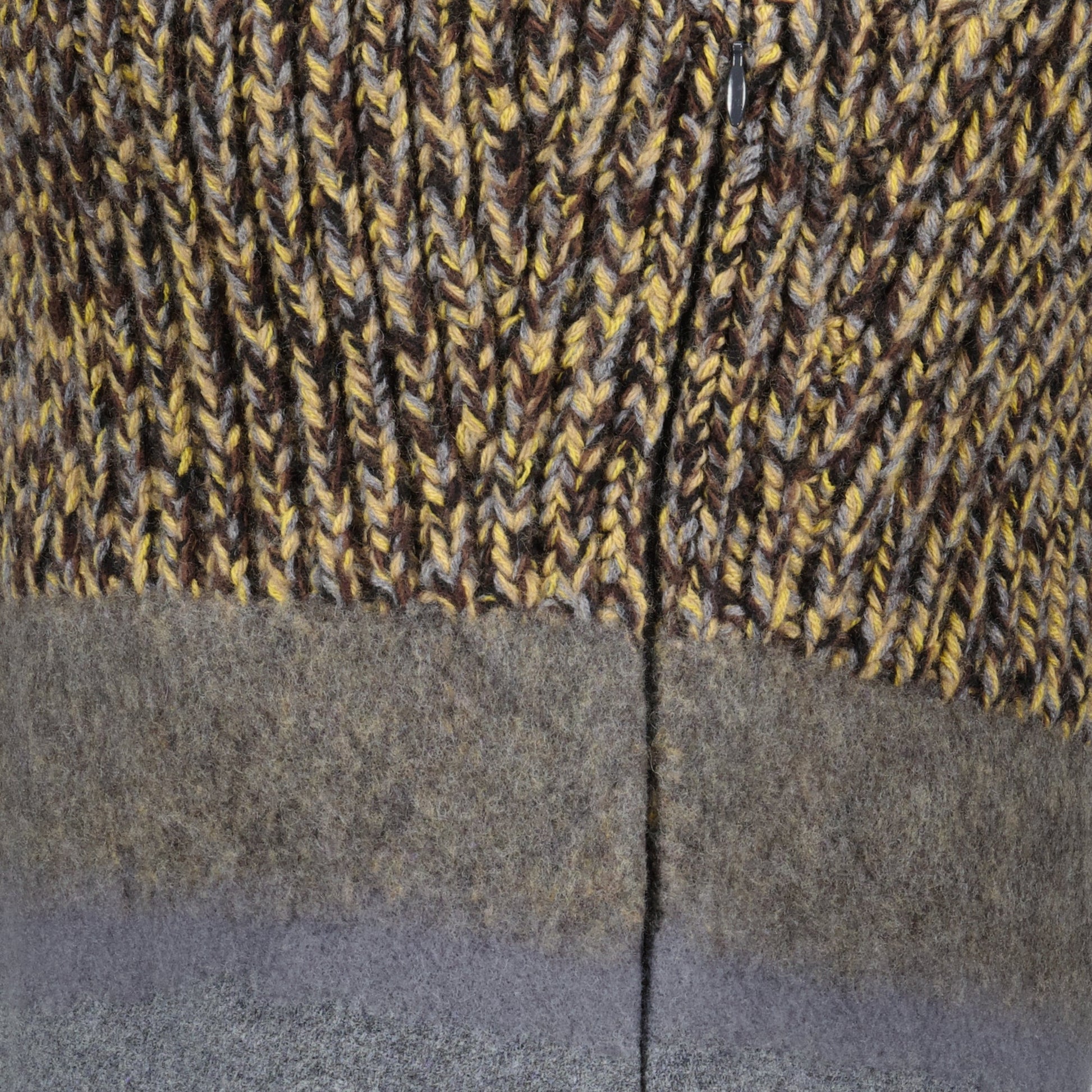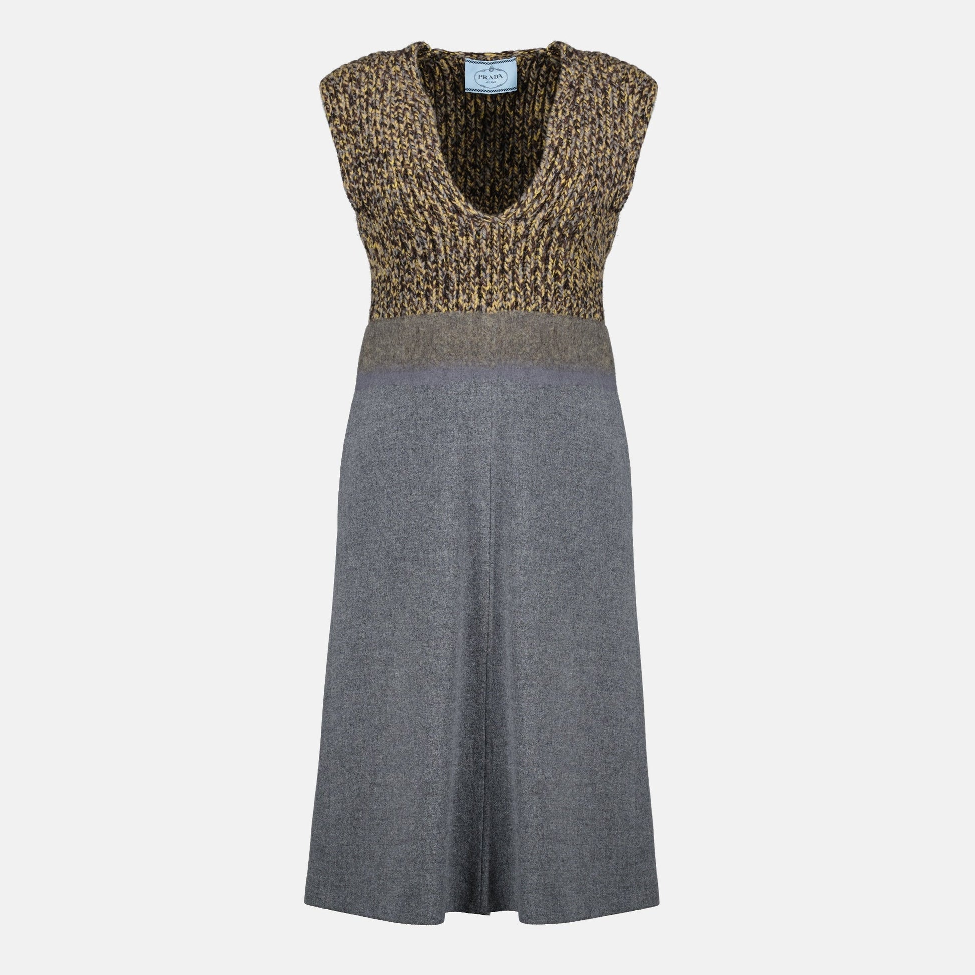 Gray wool dress by Prada for women, from the Autumn-Winter 2025 collection. It features a V-neck, a sleeveless design, and a flared cut.
