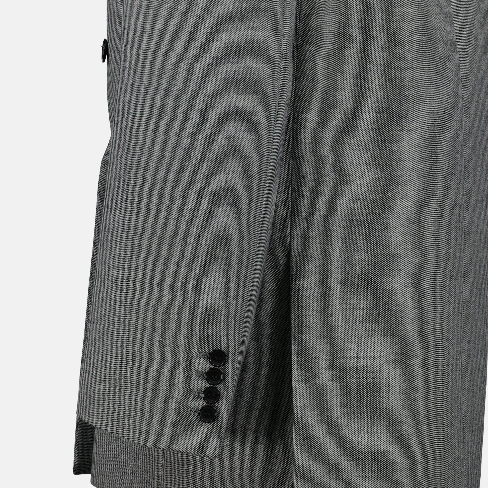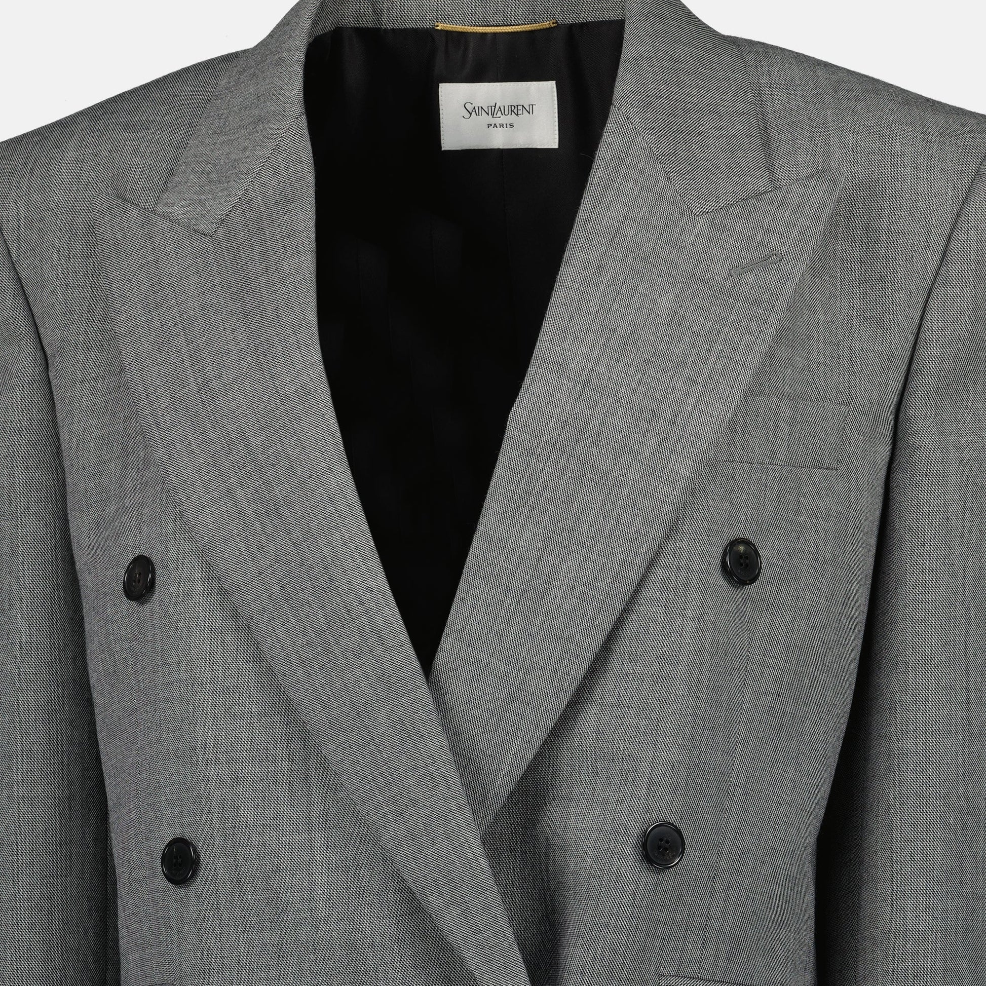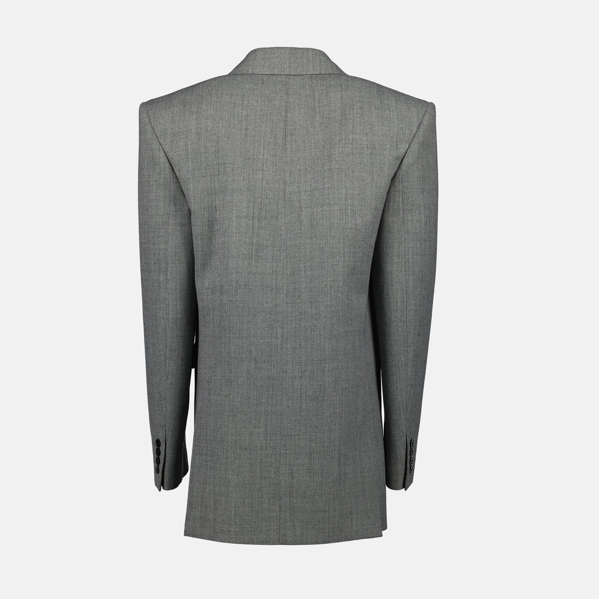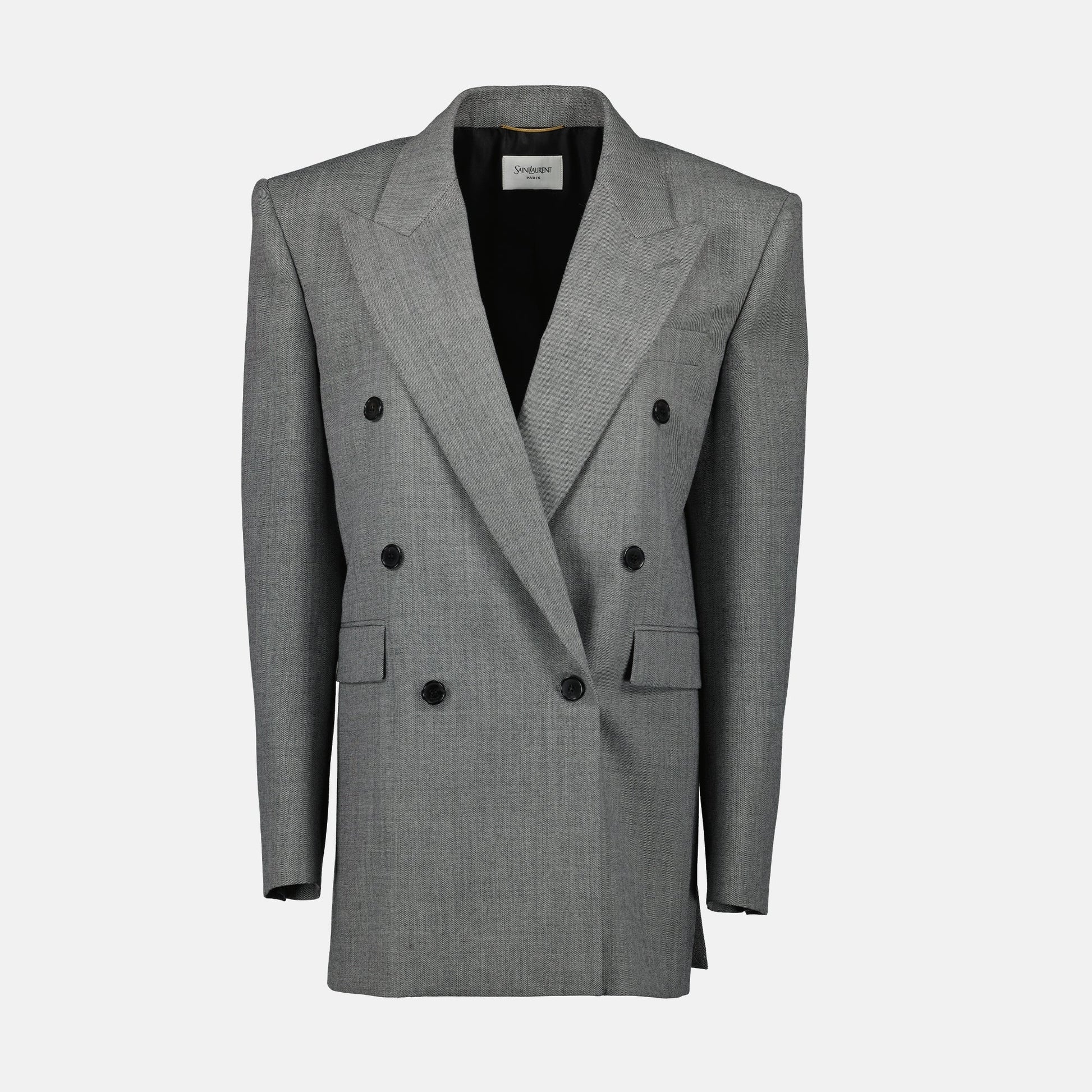 Gray wool blazer from Saint Laurent for women, Spring-Summer 2025 collection. It features a notched collar, long sleeves, and a long cut with a silk lining.