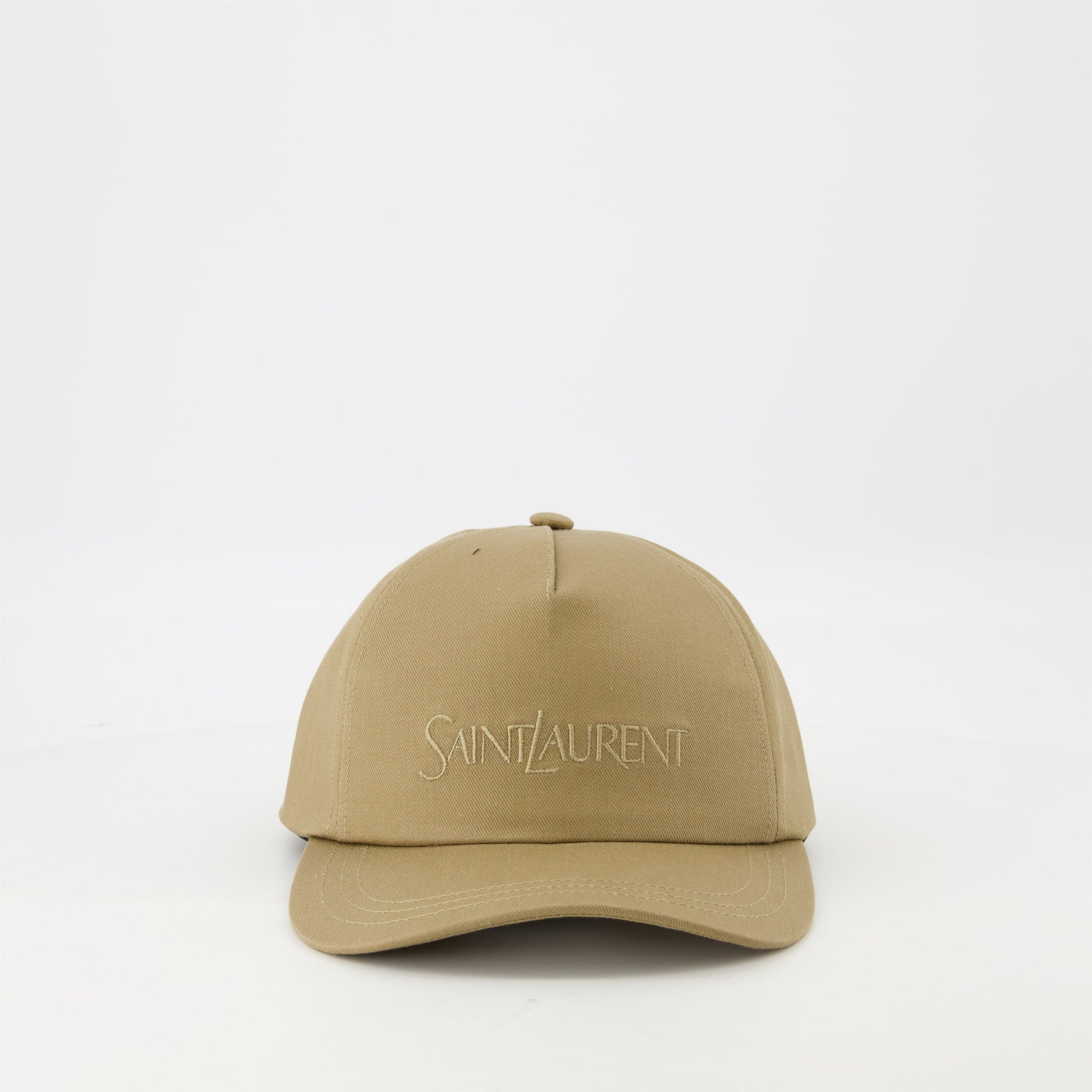 Beige embroidered cotton cap from Saint Laurent, designed for men, combines style and comfort. This piece is part of the Spring-Summer 2025 collection, perfect for a trendy look.