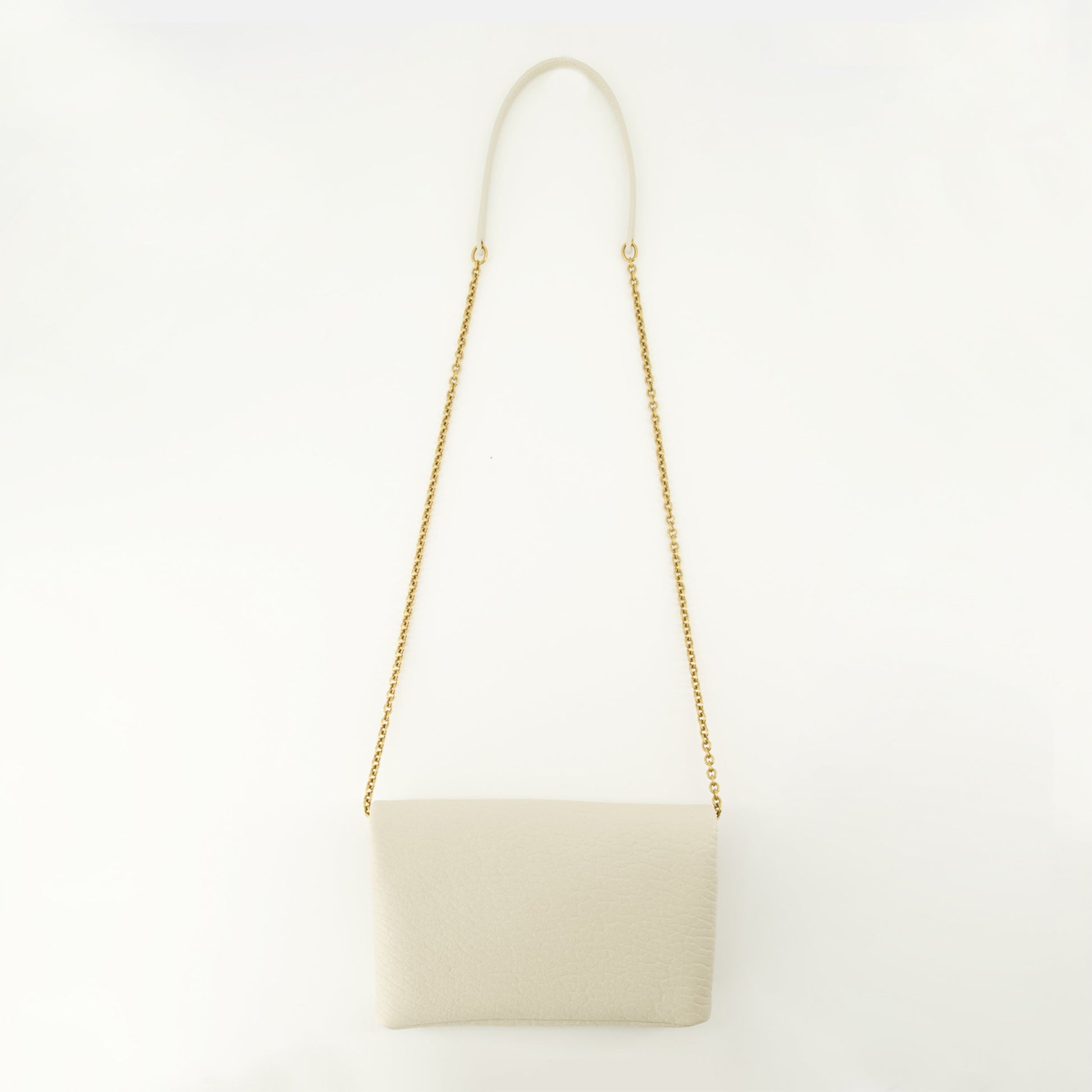 The beige Cassandre chain pouch from Saint Laurent is an elegant women's accessory, crafted from lambskin leather with a leather lining. It is part of the Spring-Summer 2025 collection.