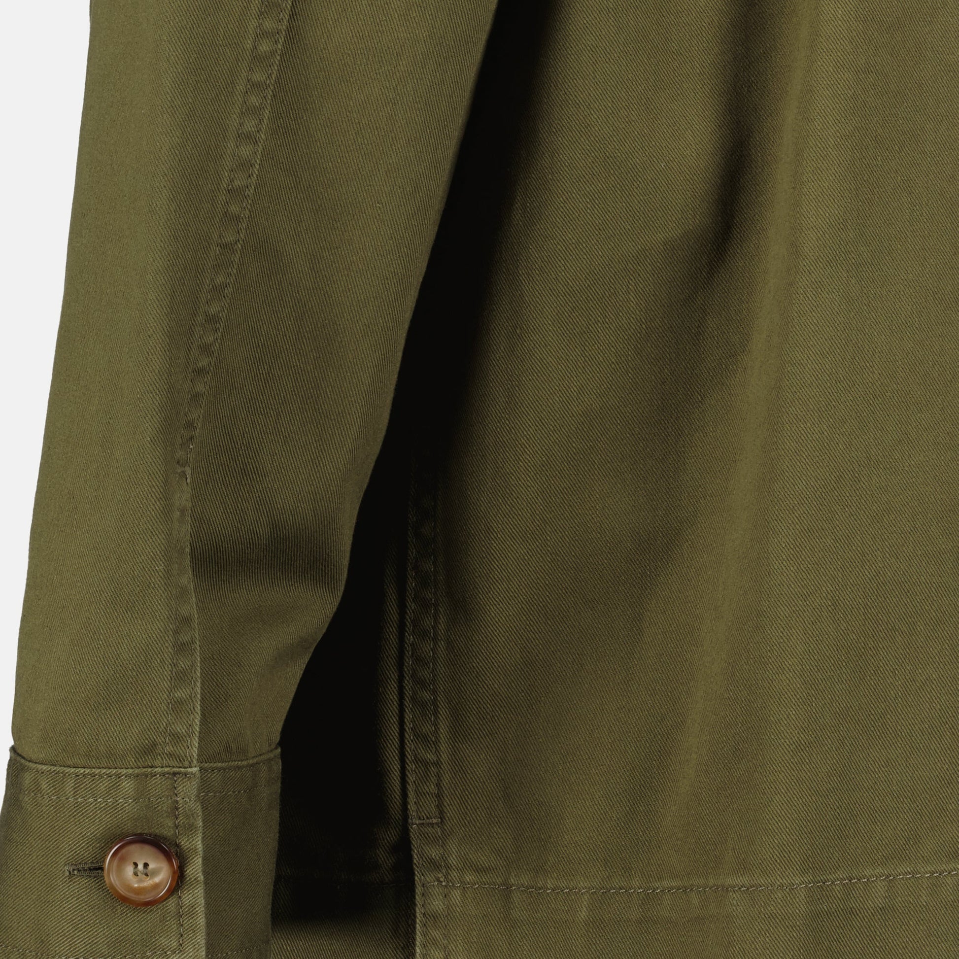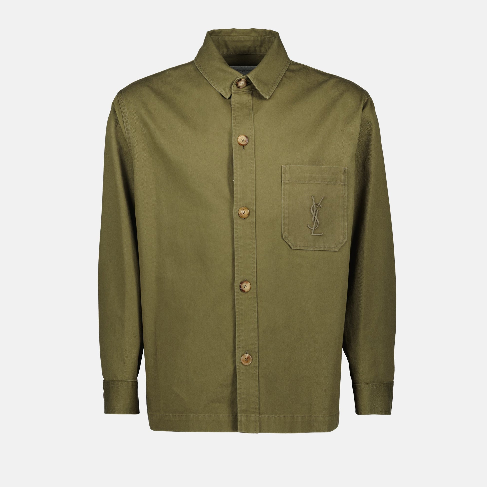 The khaki Cassandre denim shirt by Saint Laurent is a men's garment from the Autumn-Winter 2025 collection. It features a classic collar, long sleeves, and an embroidered logo.